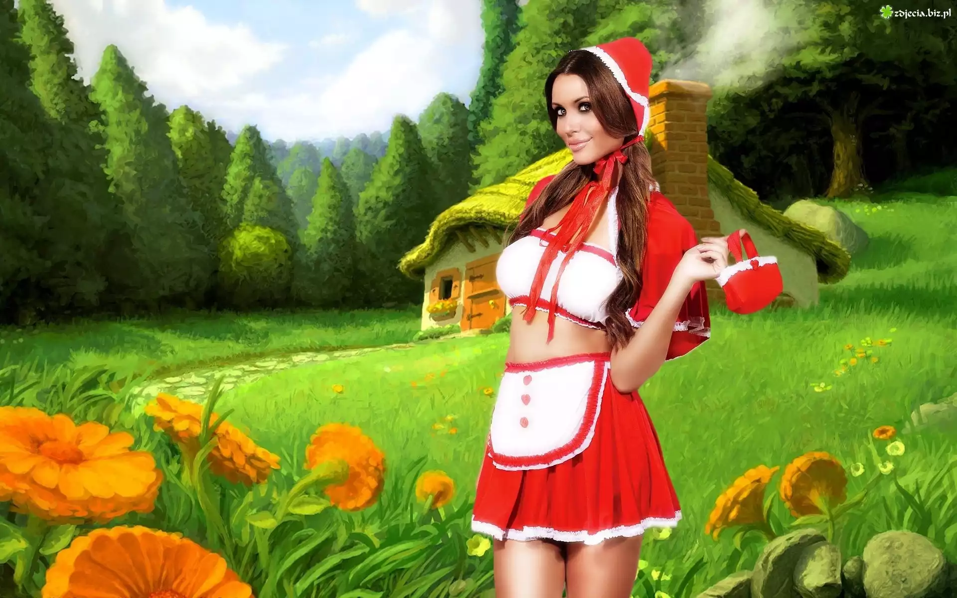 Zdjęcie Kobieta, Czerwony Kapturek, Cosplay, Chatka, Las, Kwiaty