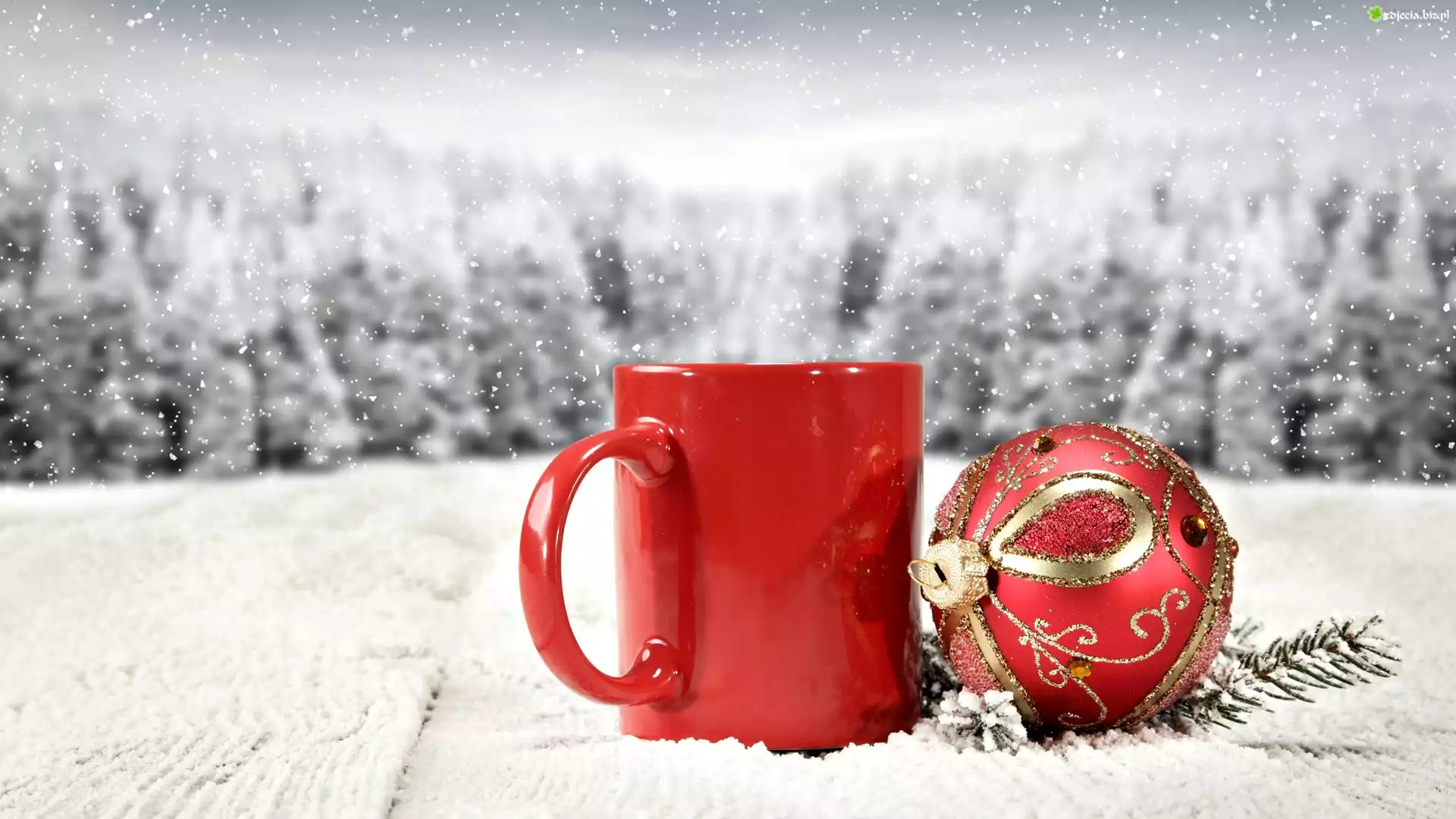 Zdjęcie Czerwony, Kubek, Bombka, Zima, Śnieg