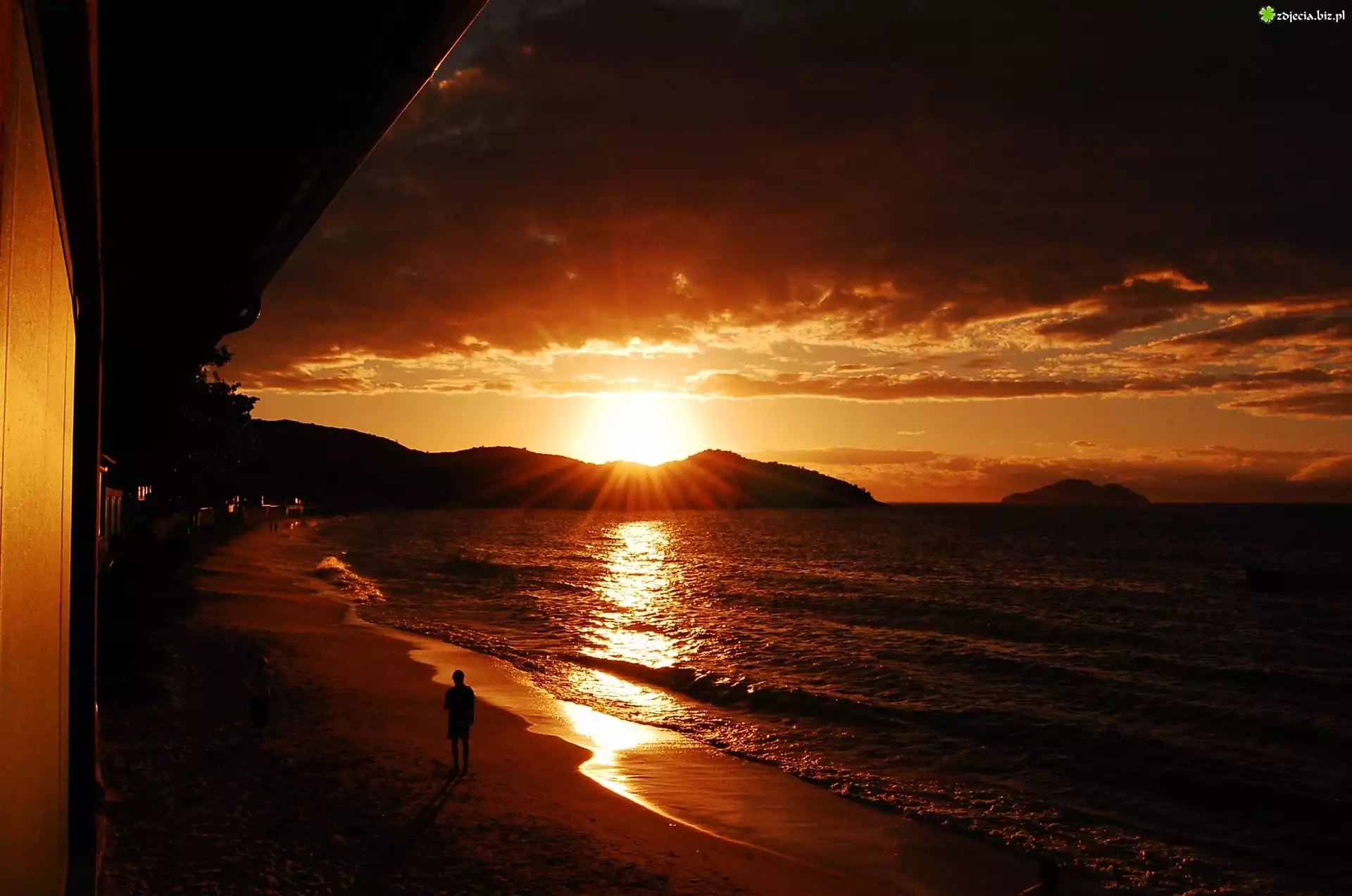 Zdjęcie, Człowiek, Plaża, Morze, Zachód, Słońca