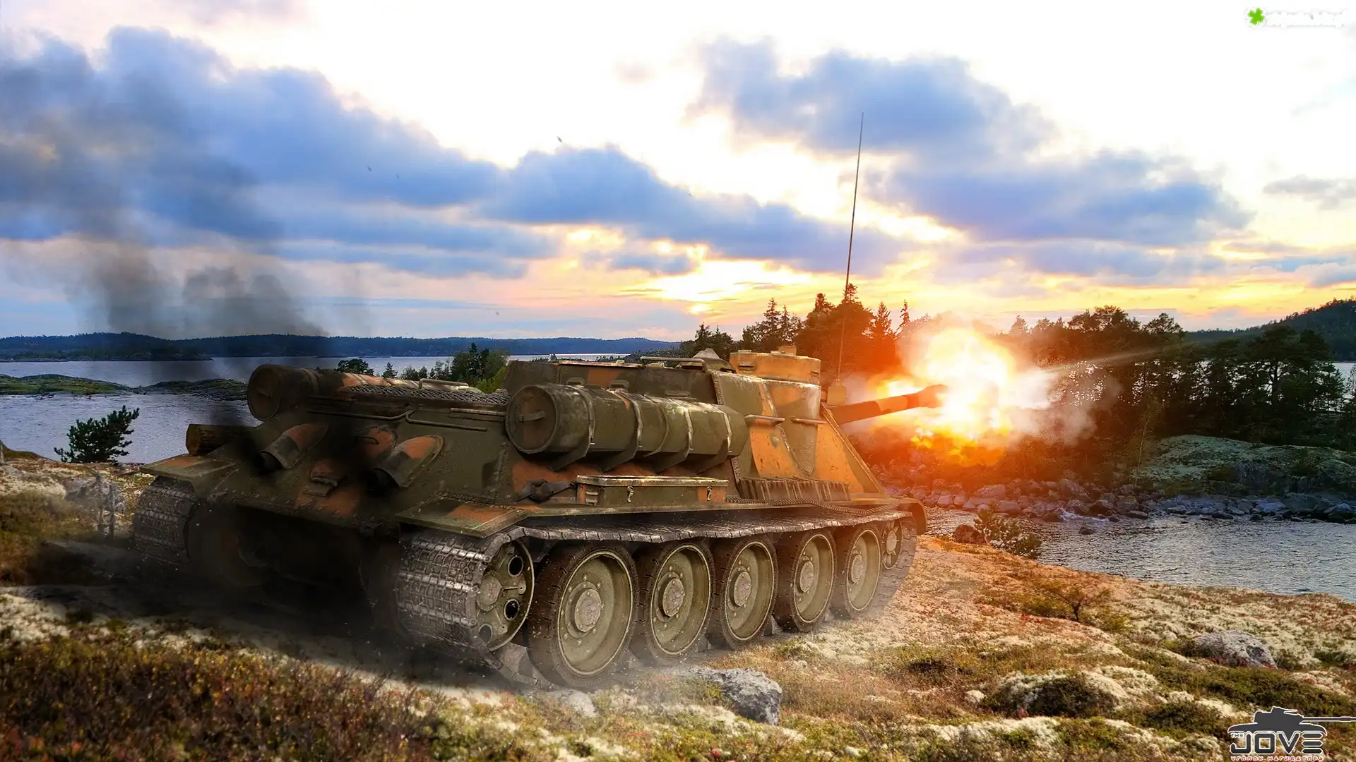 Zdjęcie Niszczyciel, Czołgów, SU-100, Ogień, Drzewa, Jezioro