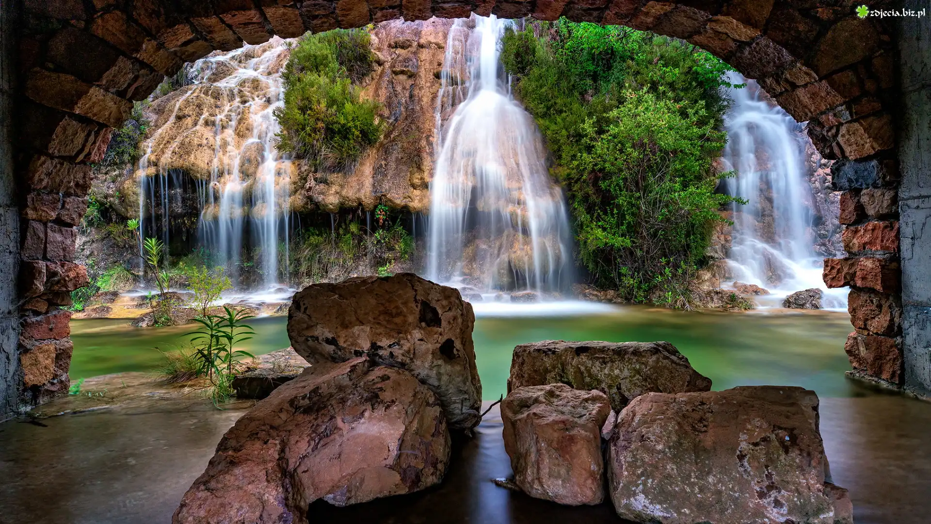 Zdjęcie Wodospad, Cascades de Lequarci, Skały, Drzewa, Kamienie, Mur, Ulassai, Sardynia, Włochy