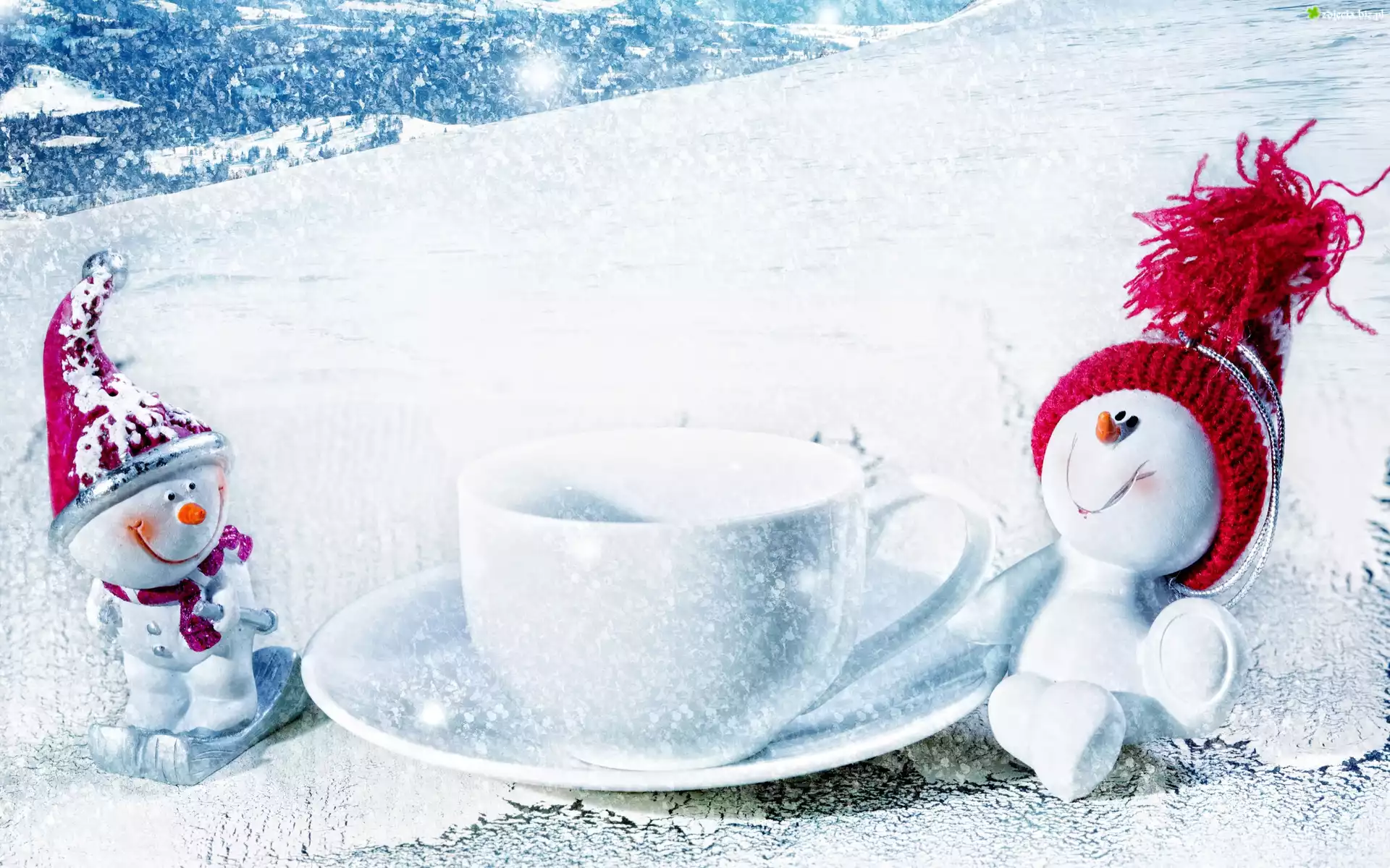 Zdjęcie Dekoracja, Świąteczna, Bałwanki, Czapki, Filiżanka, Śnieg