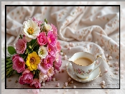 Zdjęcie Różowe, Białe, Kwiaty, Bukiet, Filiżanka, Kawa, Płótno, Dekoracja