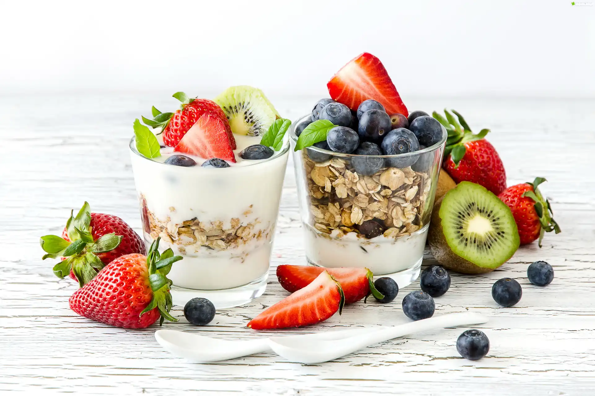 Zdjęcie, Deser, Owoce, Jogurt, Truskawki, Borówki, Kiwi
