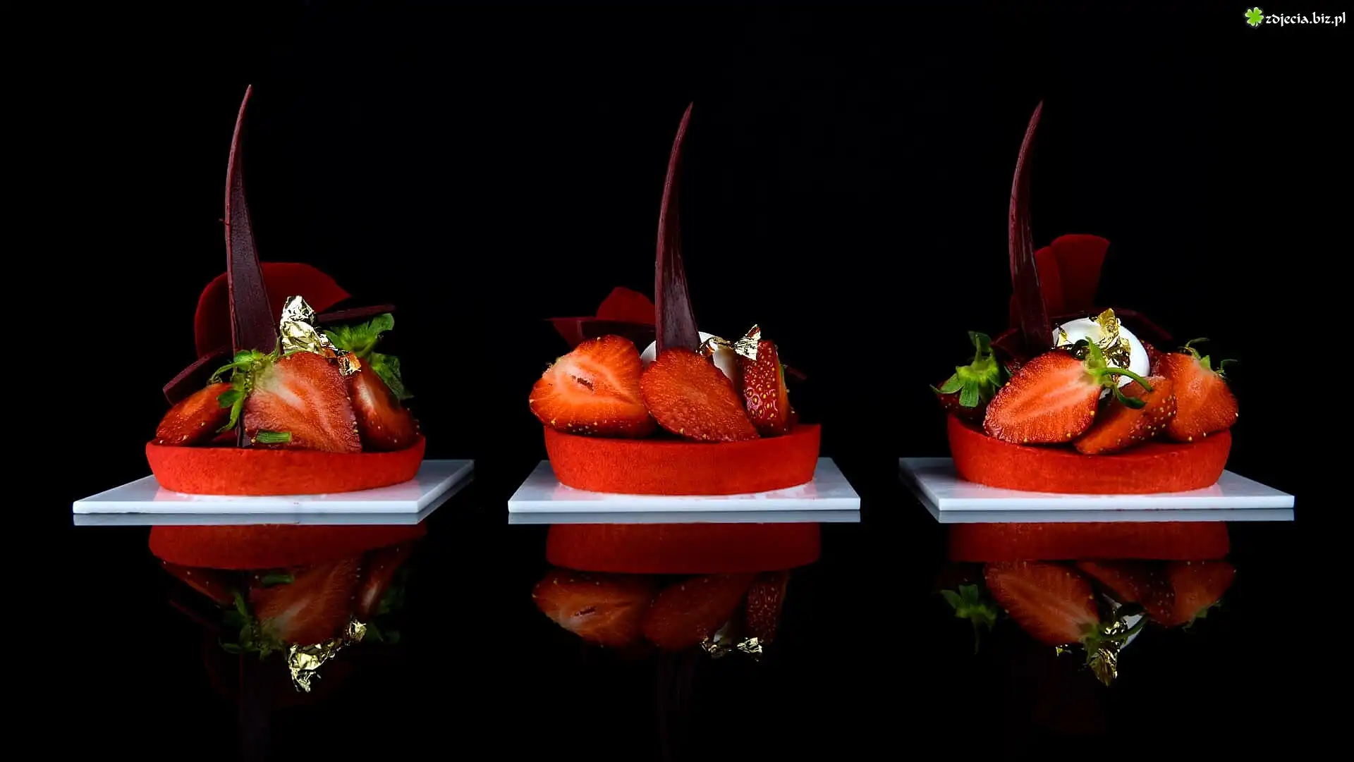Zdjęcie Ciasteczka, Deser, Truskawki, Czekolada, Ciemne tło, Odbicie