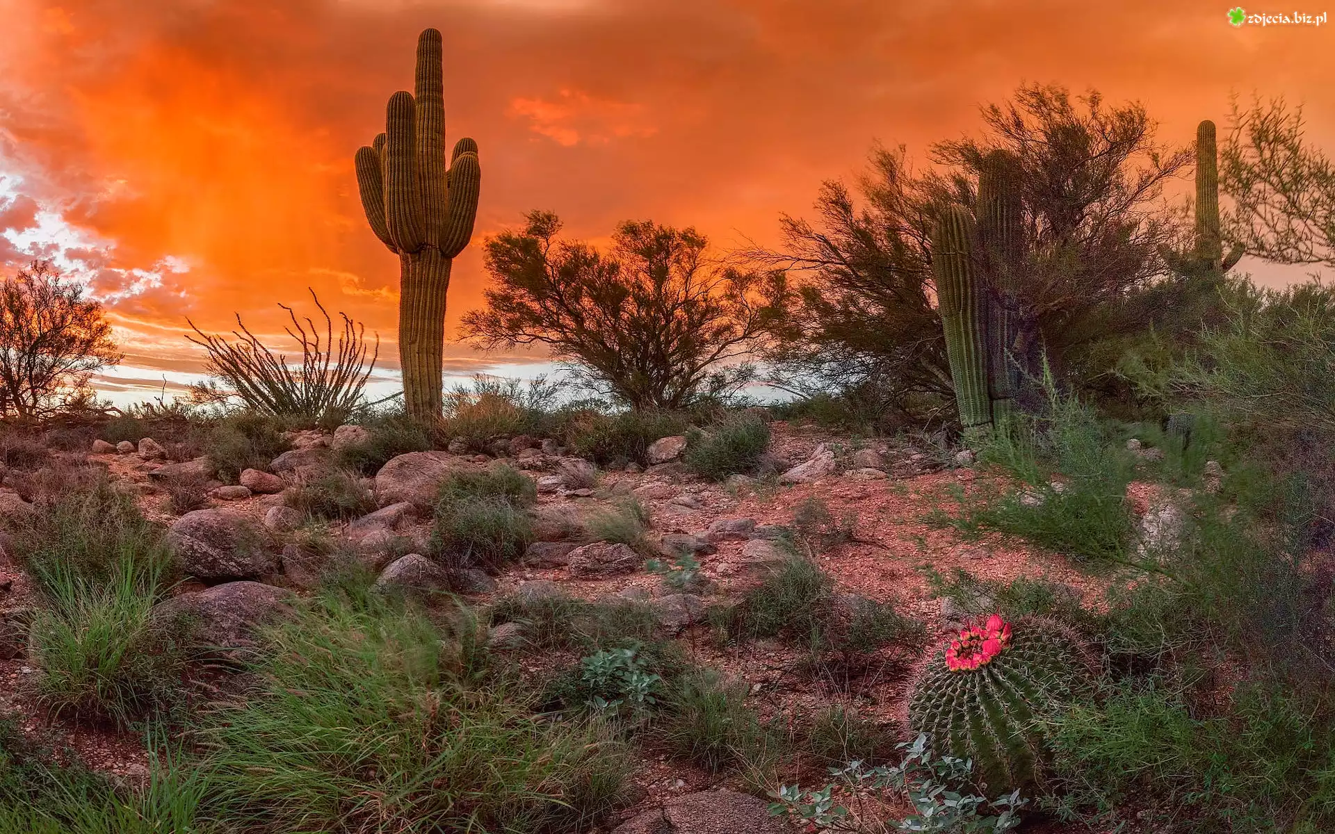 Zdjęcie Stany Zjednoczone, Arizona, Tucson, Pustynia, Sonoran Desert, Zachód słońca, Kaktusy, Krzewy |