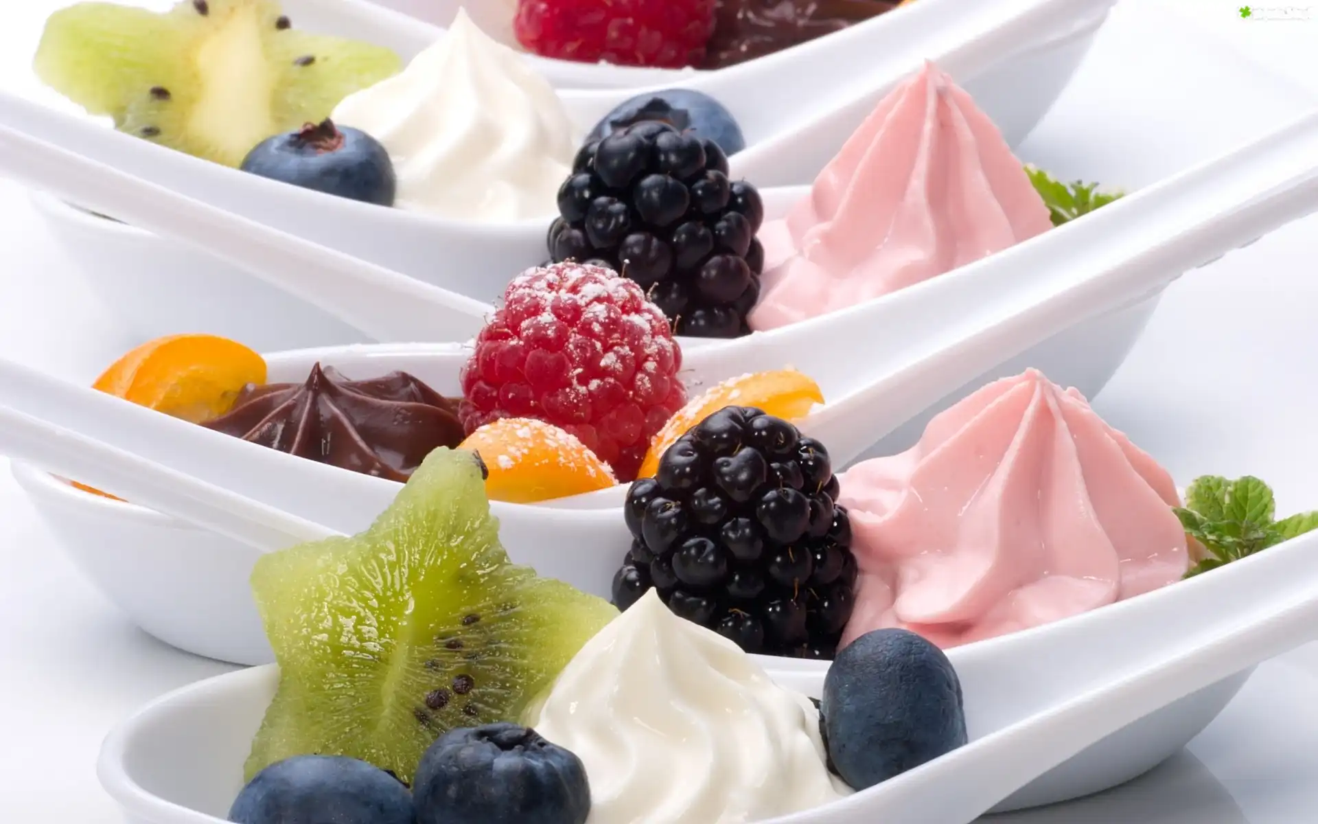 Zdjęcie Owocowe, Desery, Jogurt, Krem, Maliny, Jeżyny, Kiwi, Jagody