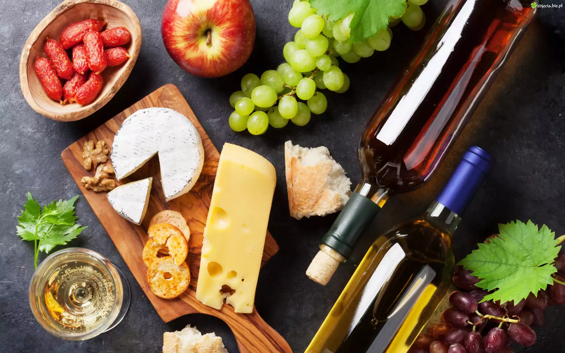Zdjęcie Kompozycja, Dwie, Butelki, Wino, Winogrona, Jabłko, Ser, Kiełbaski, Deska