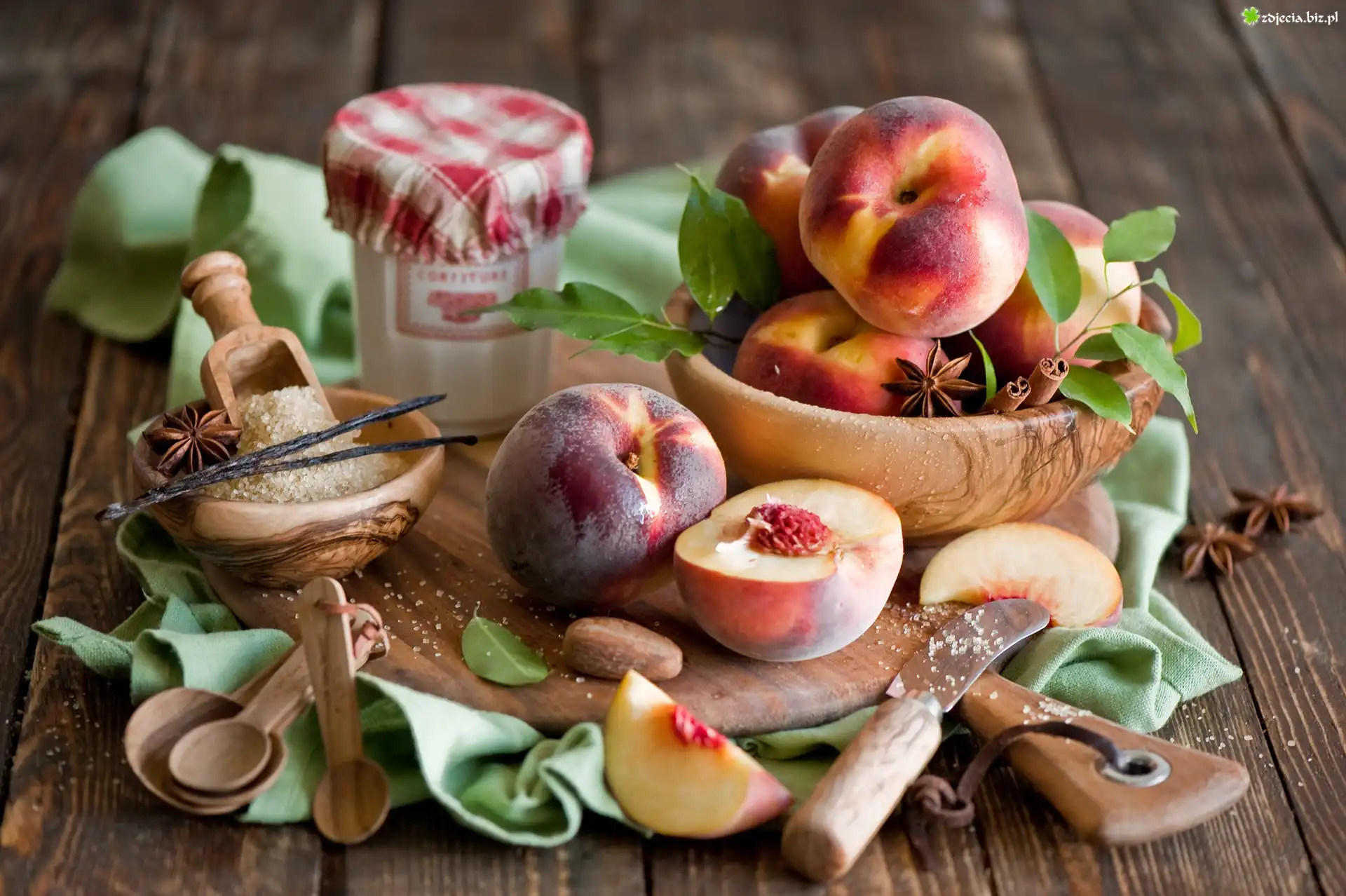 Zdjęcie Deska, Miseczki, Słoik, Brzoskwinie