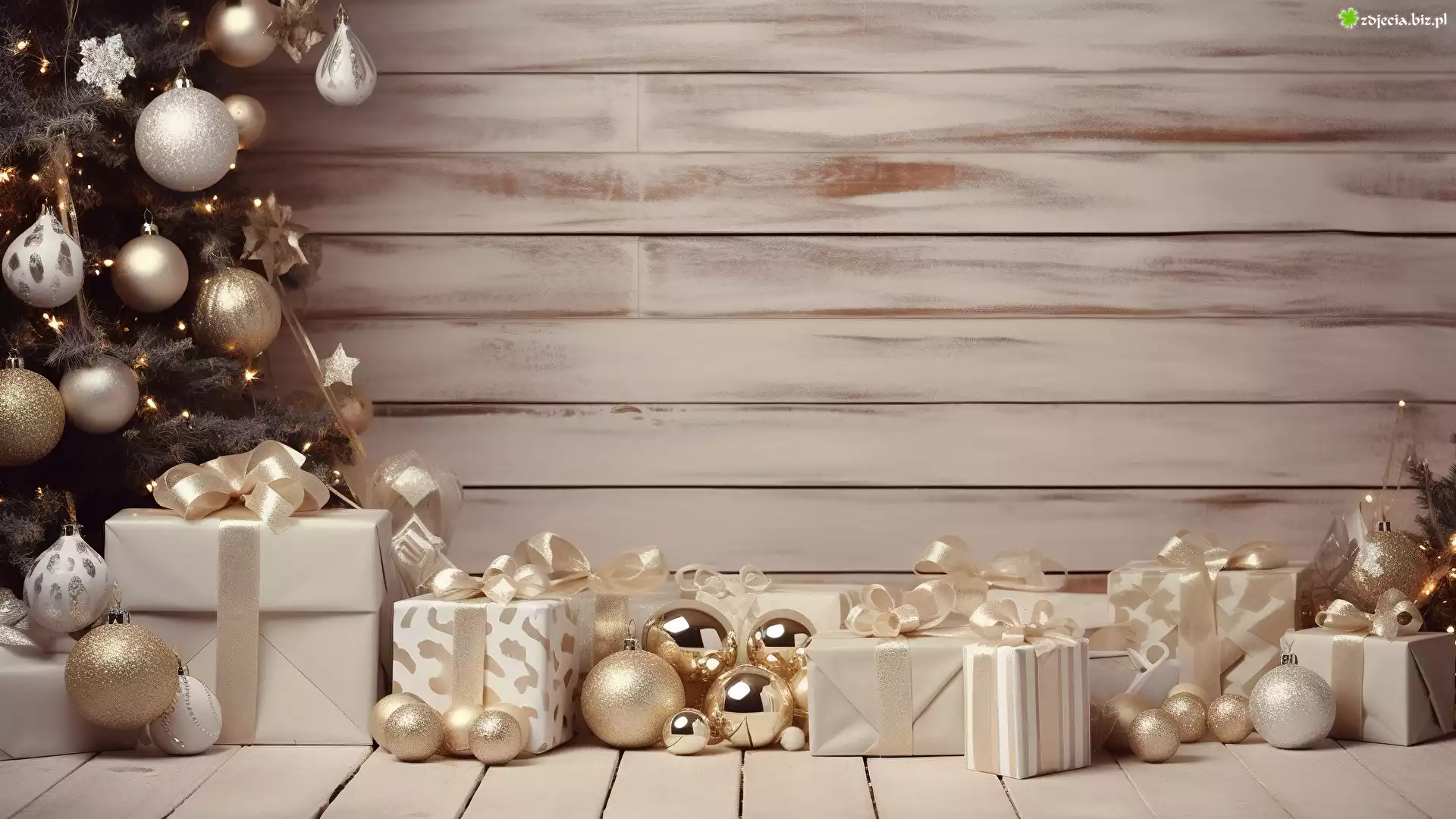 Zdjęcie Choinka, Srebrne, Bombki, Światełka, Pudełka, Prezenty, Kokardki, Deski