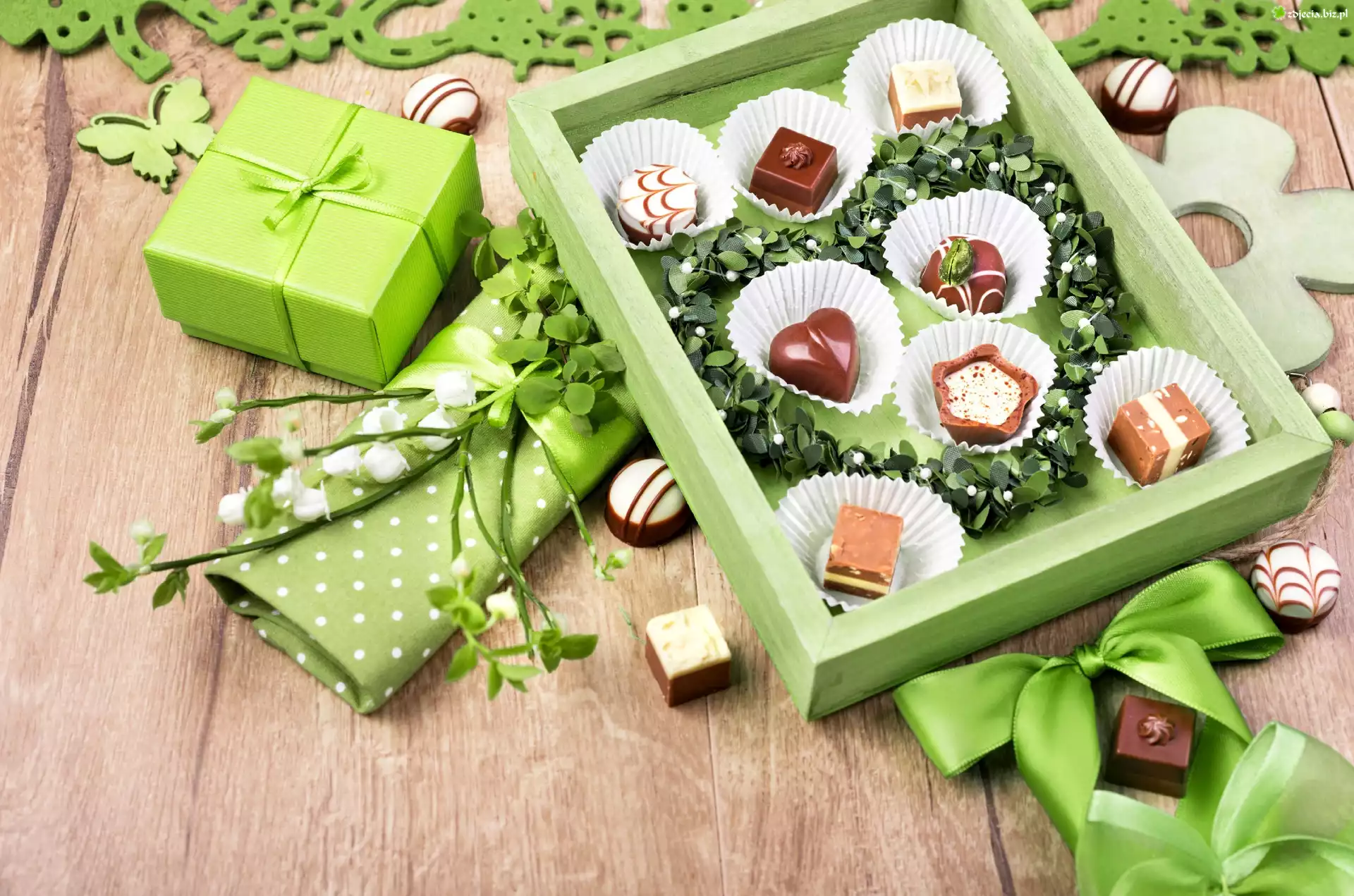 Zdjęcie Kompozycja, Słodycze, Czekoladki, Pralinki, Prezent, Serwetka, Gałązka, Wstążka, Deski |