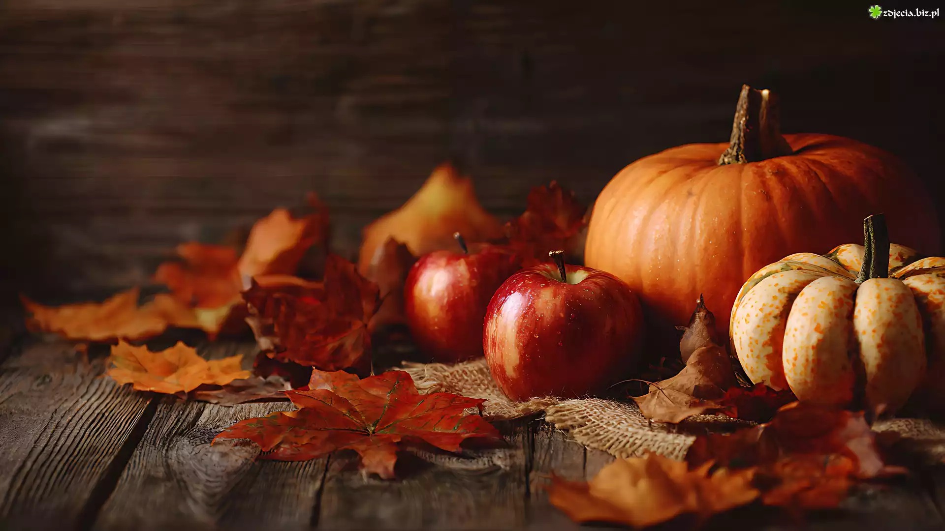 Zdjęcie Dynie, Jabłka, Liście, Deski