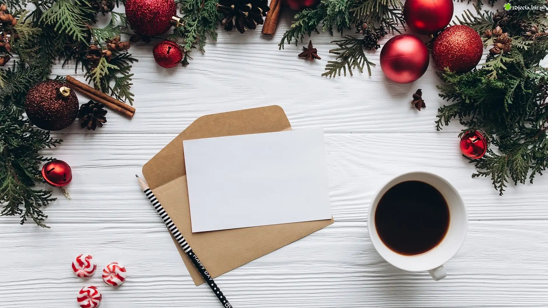 Zdjęcie Kawa, Kartka, Koperta, Cukierki, Gałązki, Bombki, Prezenty, Boże Narodzenie, Deski
