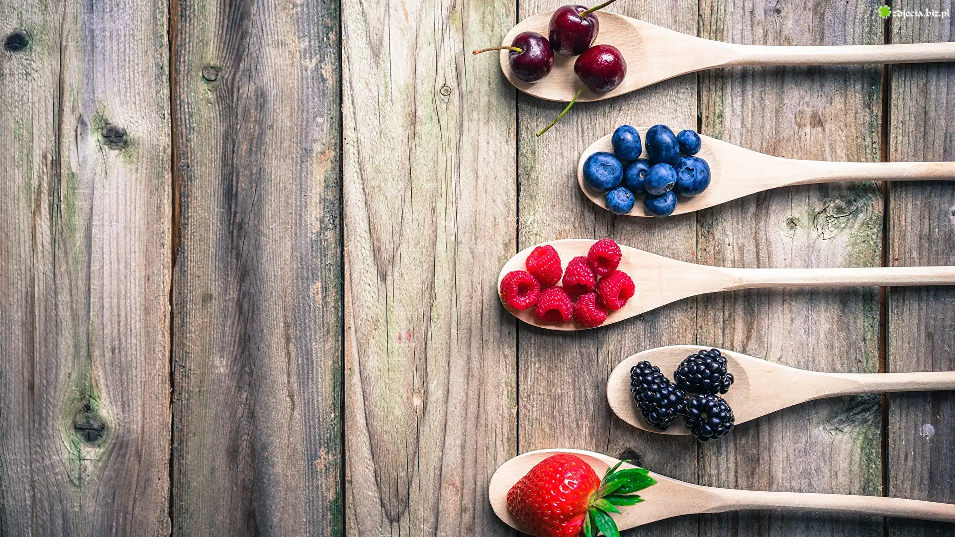 Zdjęcie Drewniane, Łyżki, Owoce, Truskawka, Jeżyny, Maliny, Borówki, Czereśnie, Deski