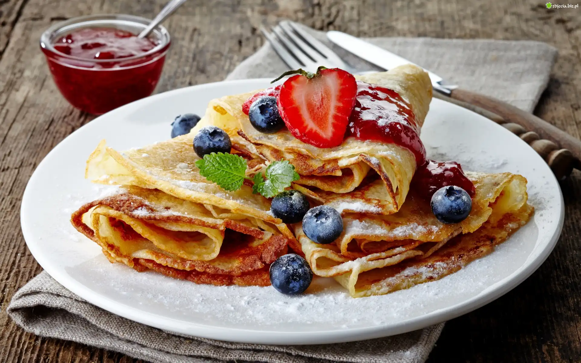 Zdjęcie, Naleśniki, Truskawka, Borówki, Cukier puder, Marmolada, Talerz, Miseczka, Ścierka, Deski