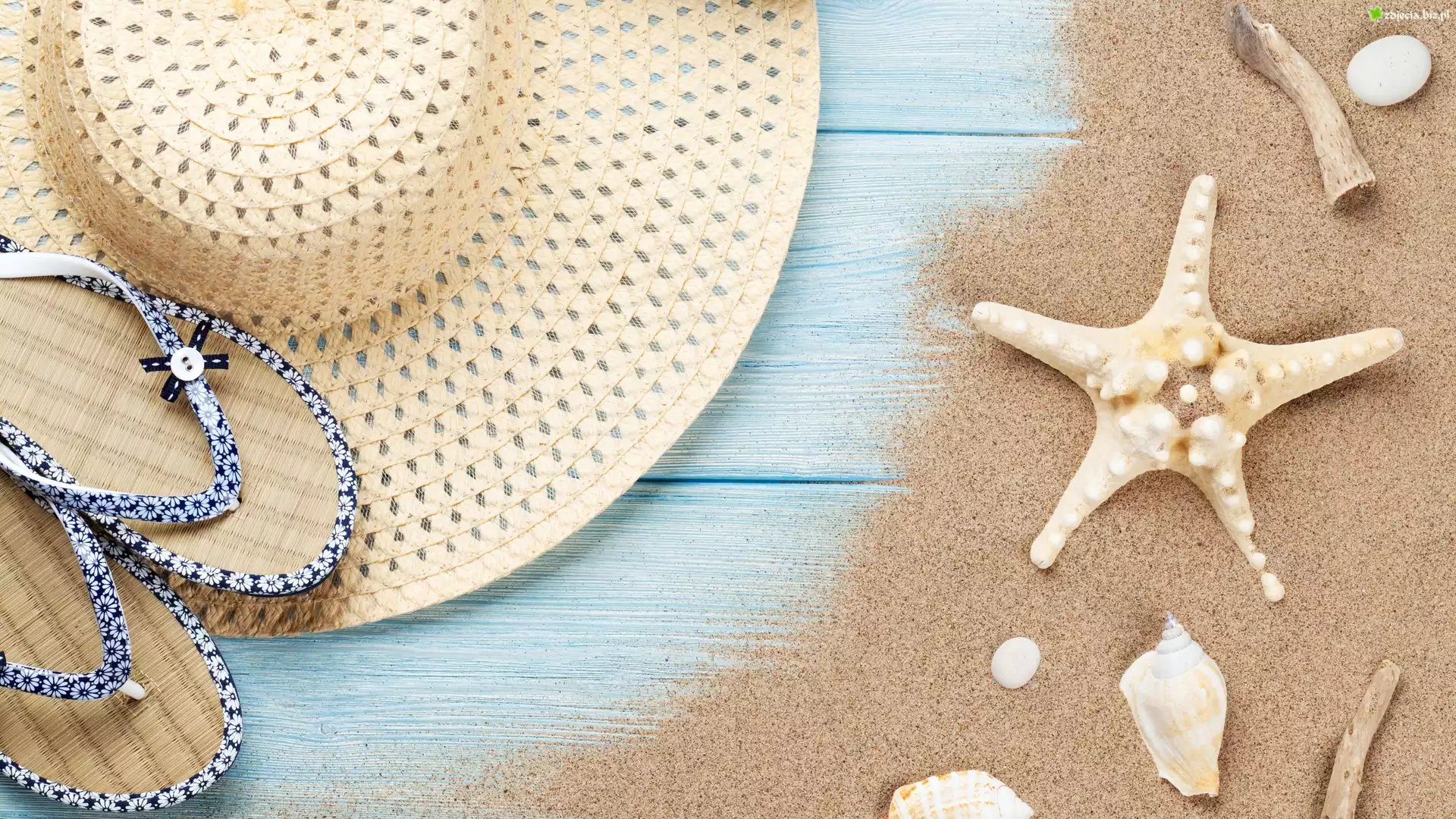 Zdjęcie Deski, Piasek, Kapelusz, Japonki, Rozgwiazda, Muszelki