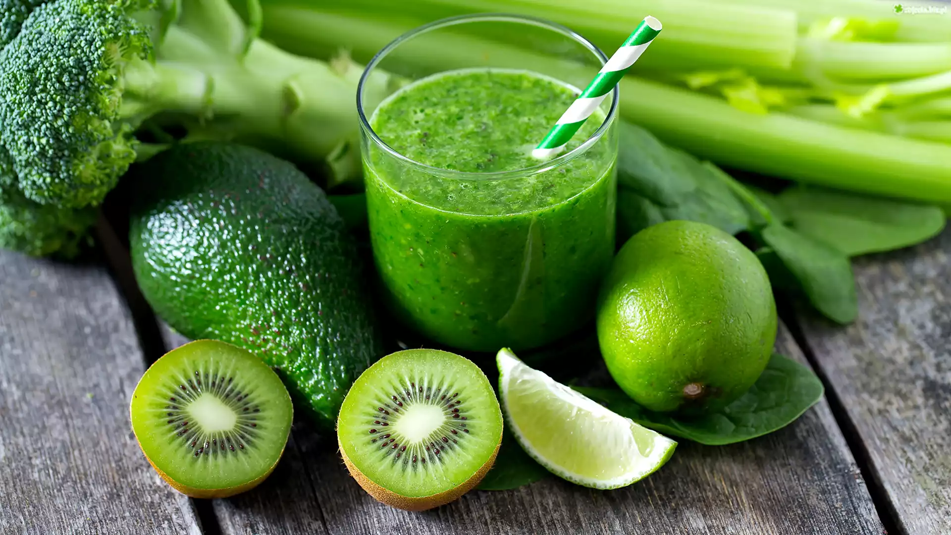 Zdjęcie Sok, Owocowo-warzywny, Szklanka, Słomka, Brokuł, Awokado, Kiwi, Limonka, Deski