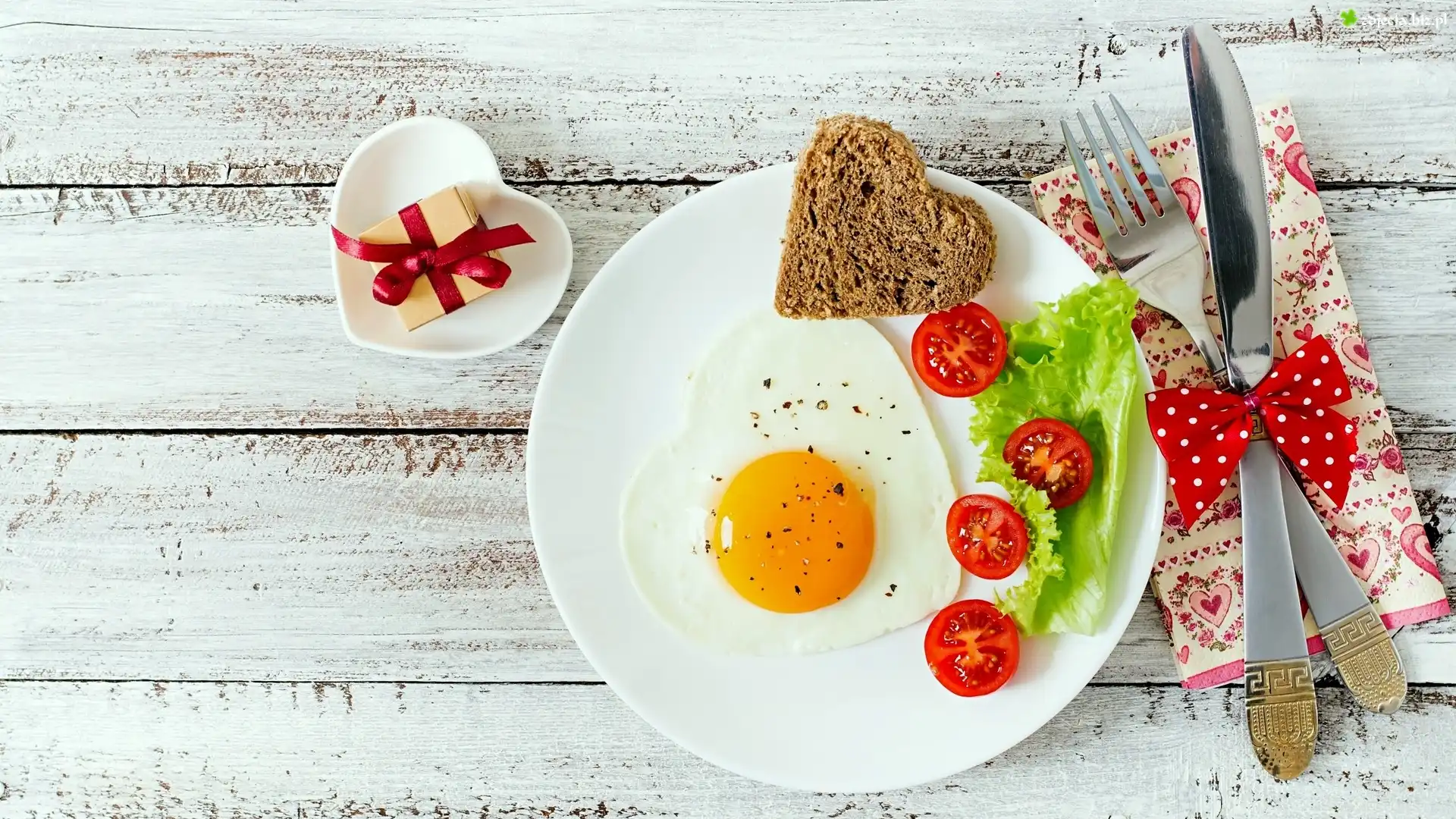 Zdjęcie, Walentynki, Nakrycie, Talerz, Jajko, Sztućce, Serca, Prezent, Serwetka, Deski