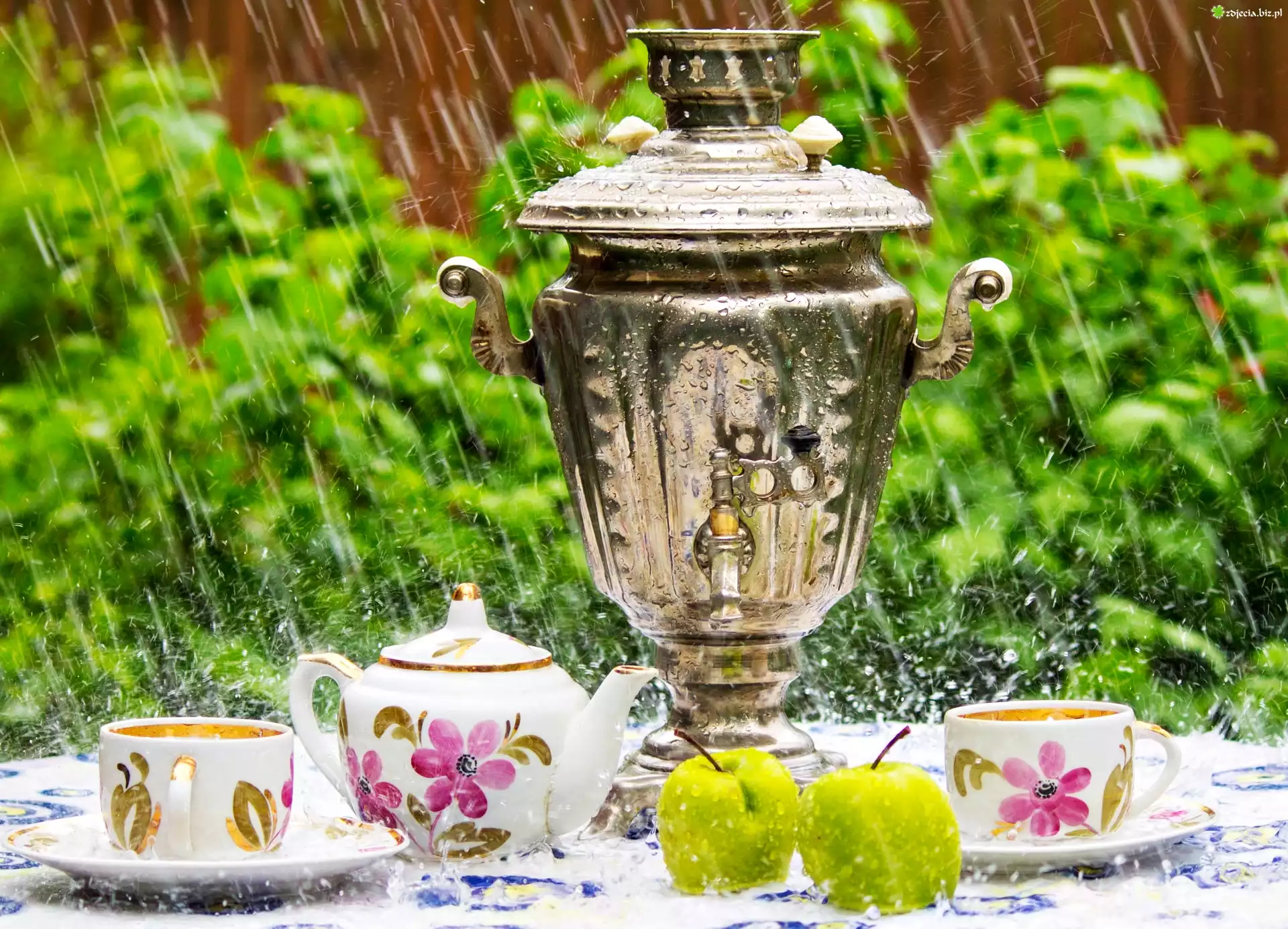 Zdjęcie Deszcz, Samowar, Filiżanki, Jabłka