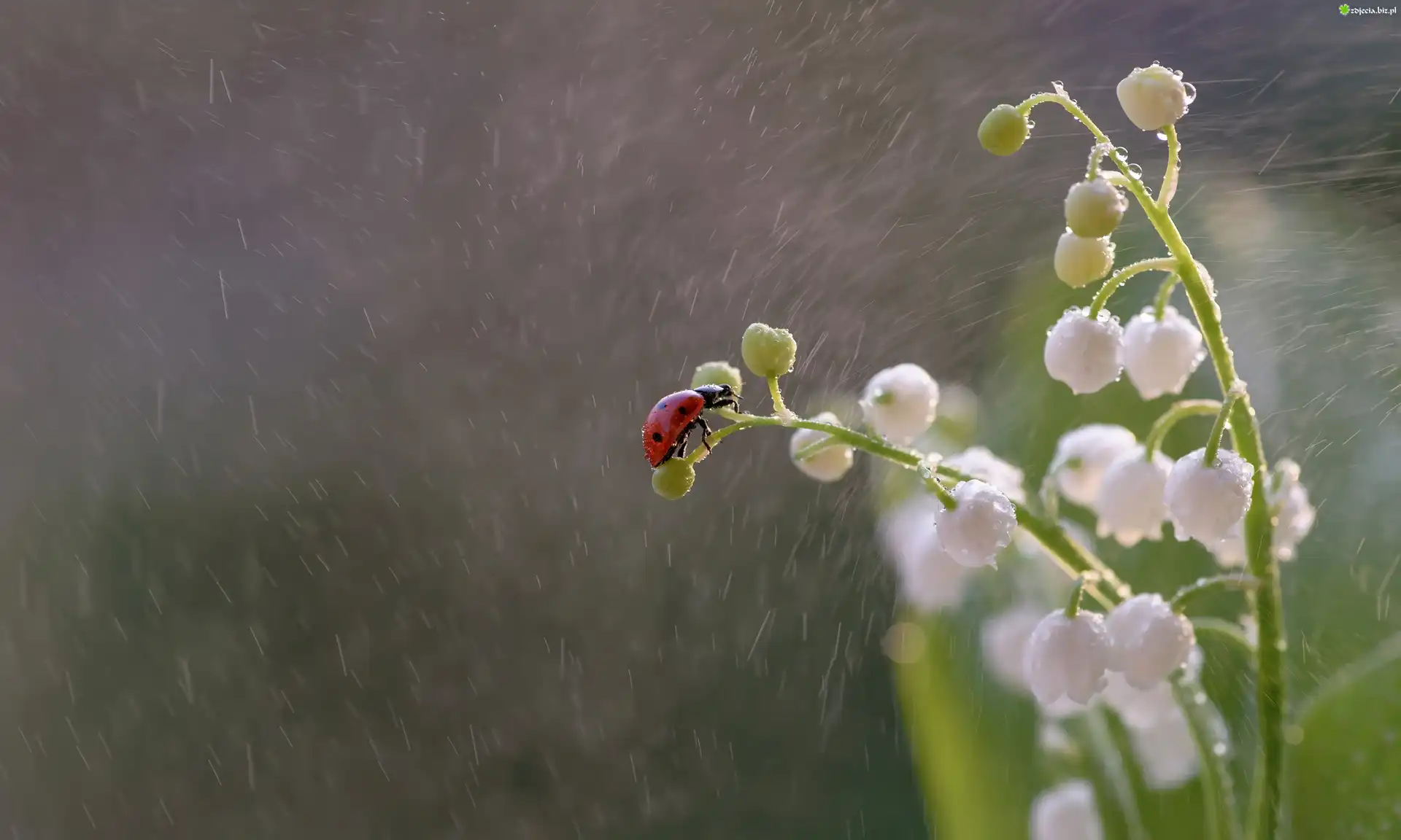 Zdjęcie Kwiaty, Konwalie, Biedronka, Deszcz