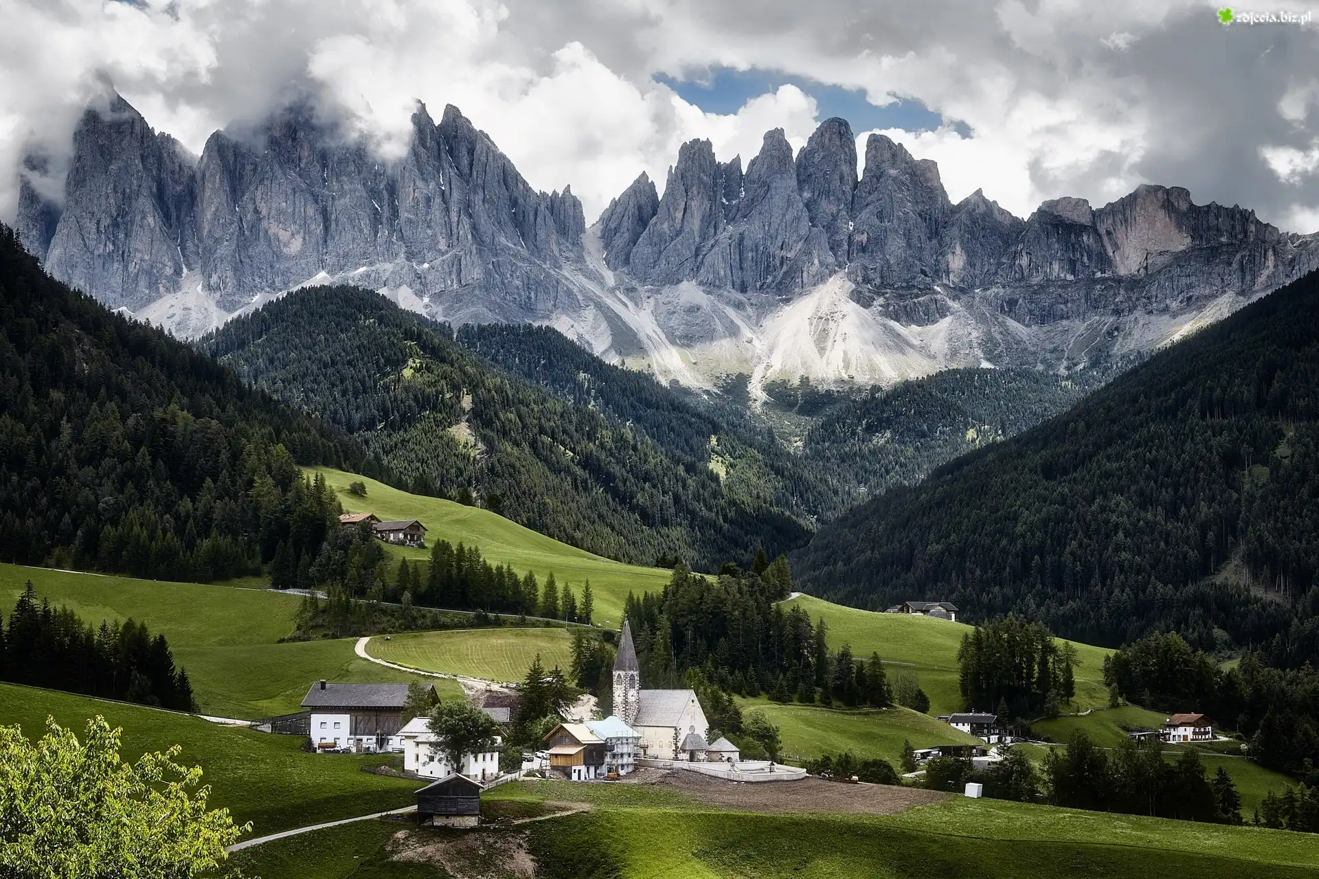 Zdjęcie Dolina Val di Funes, Wieś Santa Maddalena, Włochy, Kościół, Góry, Dolomity