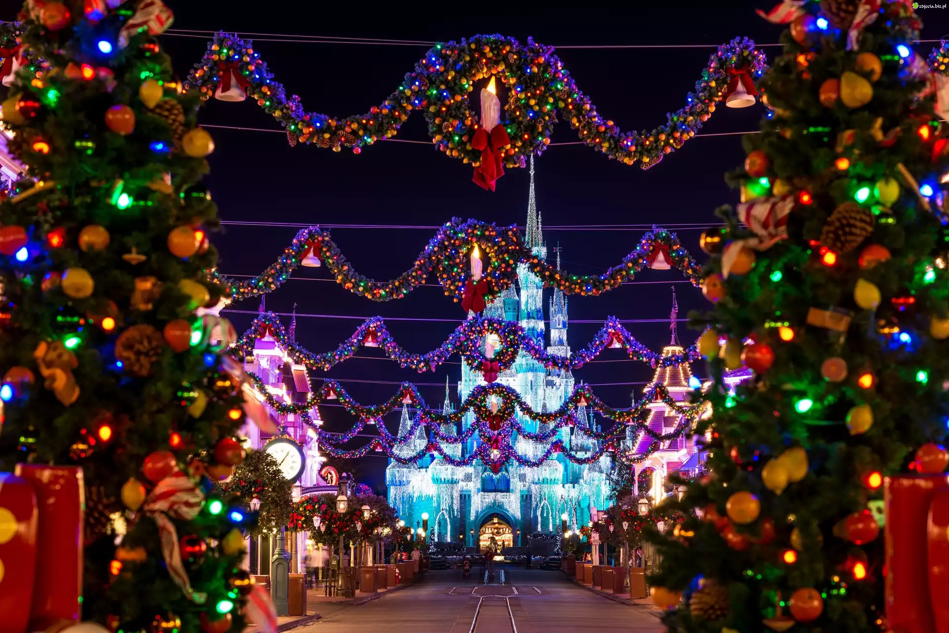 Zdjęcie, Disneyland, Zamek, Świąteczny Wystrój, Miasto Nocą