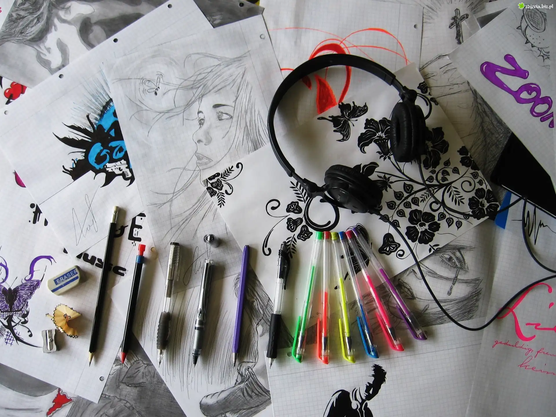 Zdjęcie Długopisy, Ołówki, Słuchawki, Rysunki