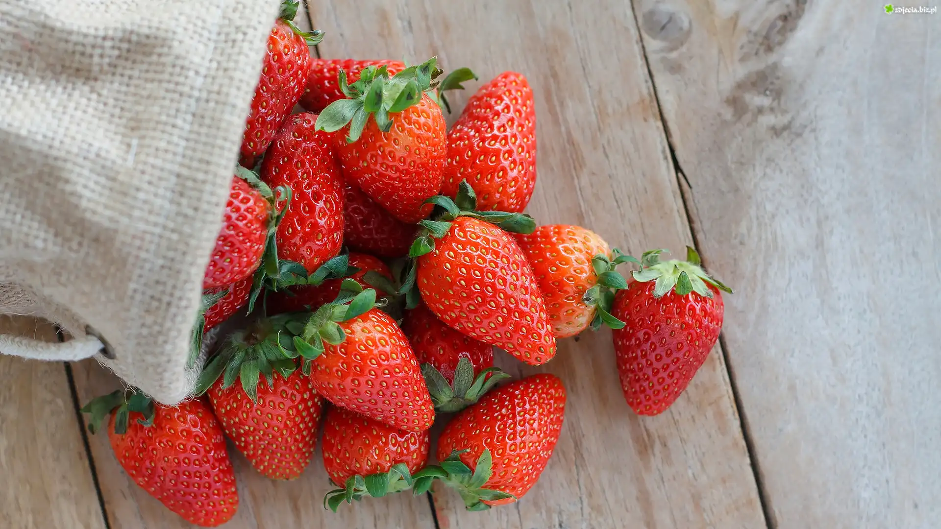 Zdjęcie Dojrzałe, Truskawki, Woreczek, Deski