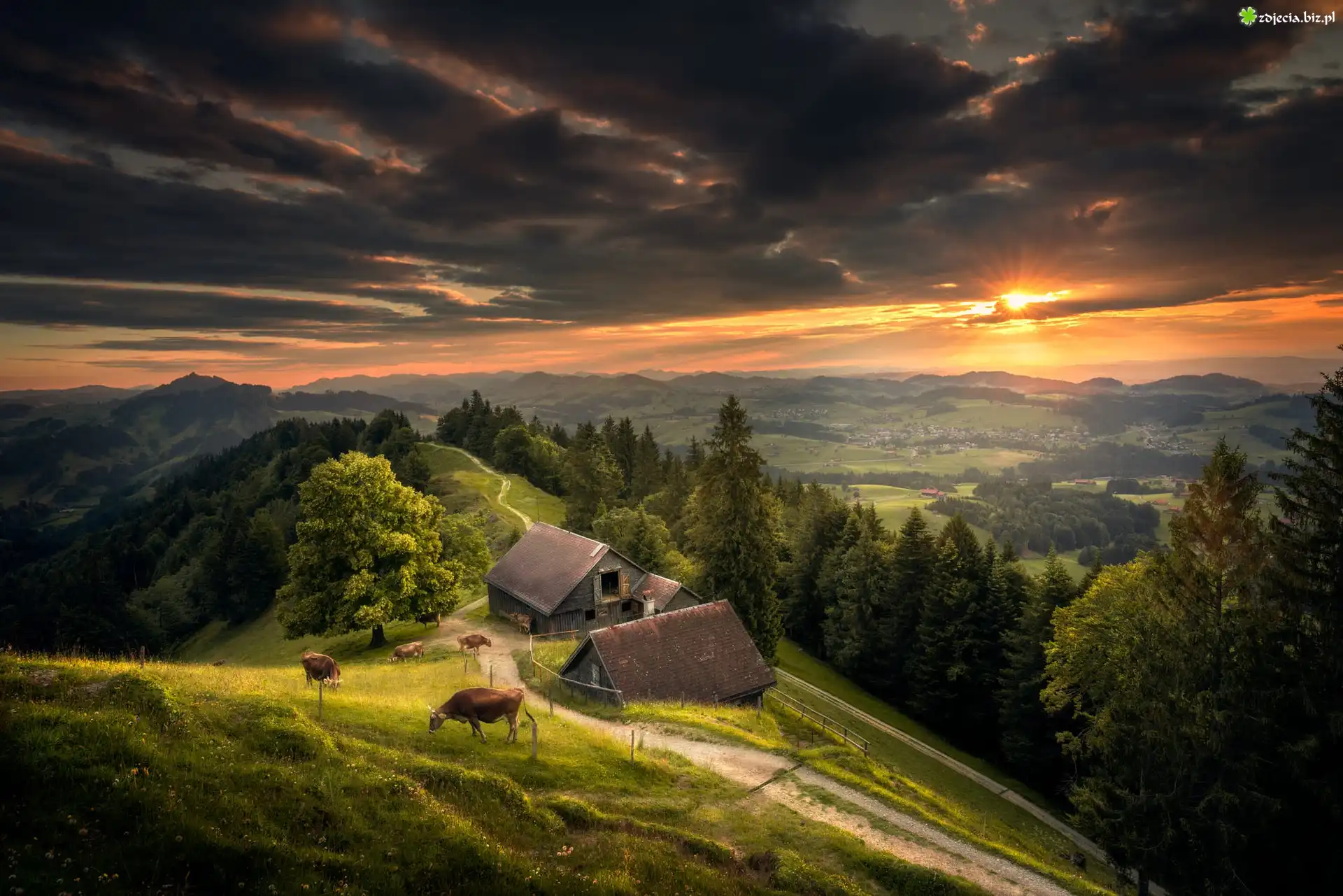 Zdjęcie, Łąka, Krowy, Domy, Stodoły, Dolina, Góry Alpy, Niebo, Zachód słońca, Szwajcaria