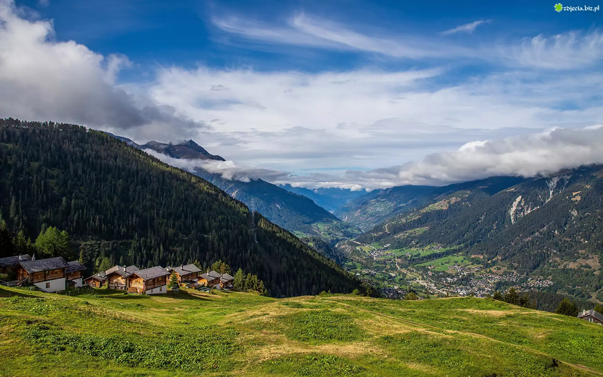 Zdjęcie Góry, Dolina, Domy, Niebo, Chmury
