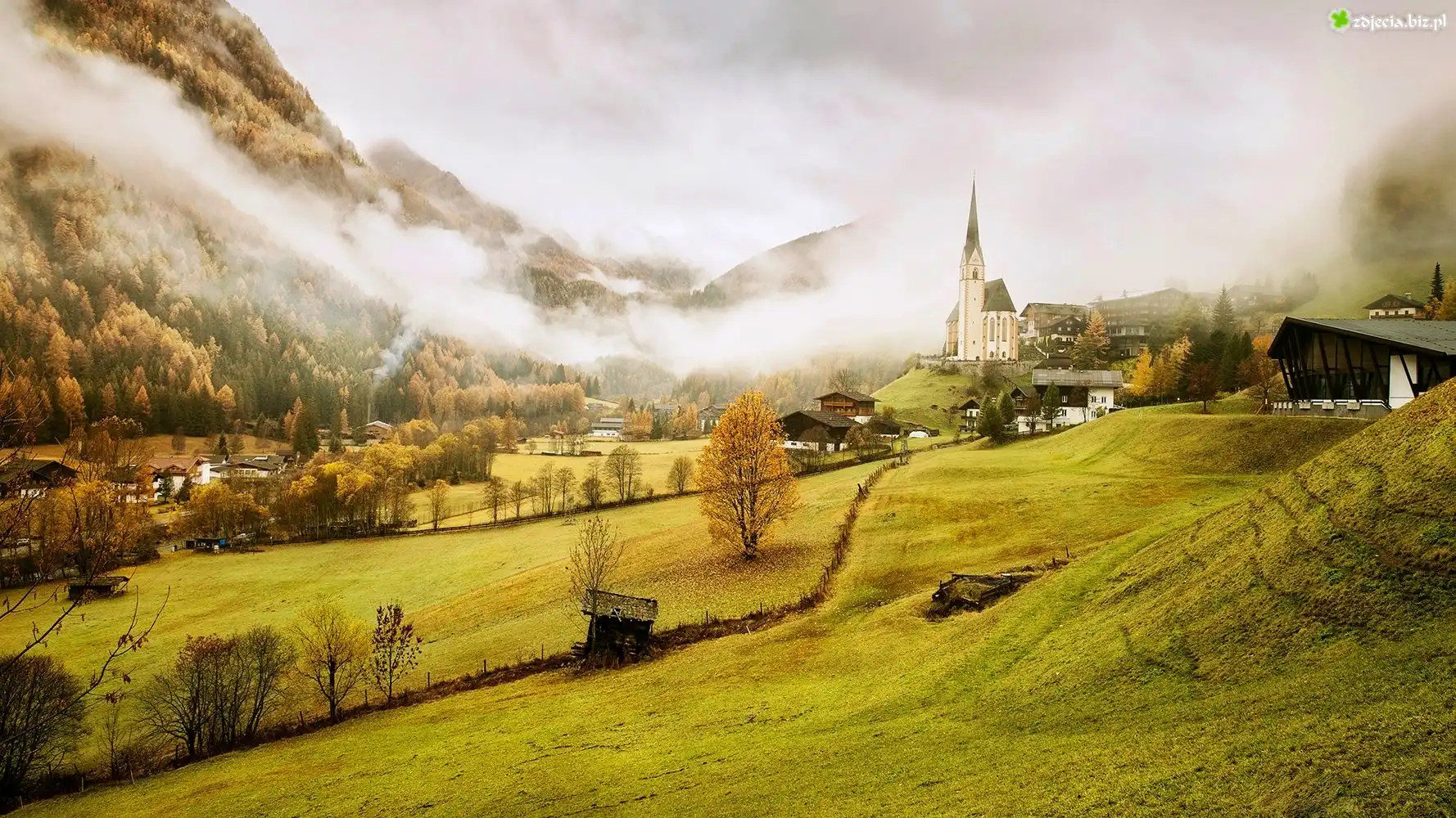 Zdjęcie Dolina, Góry, Miasteczko, Mgła