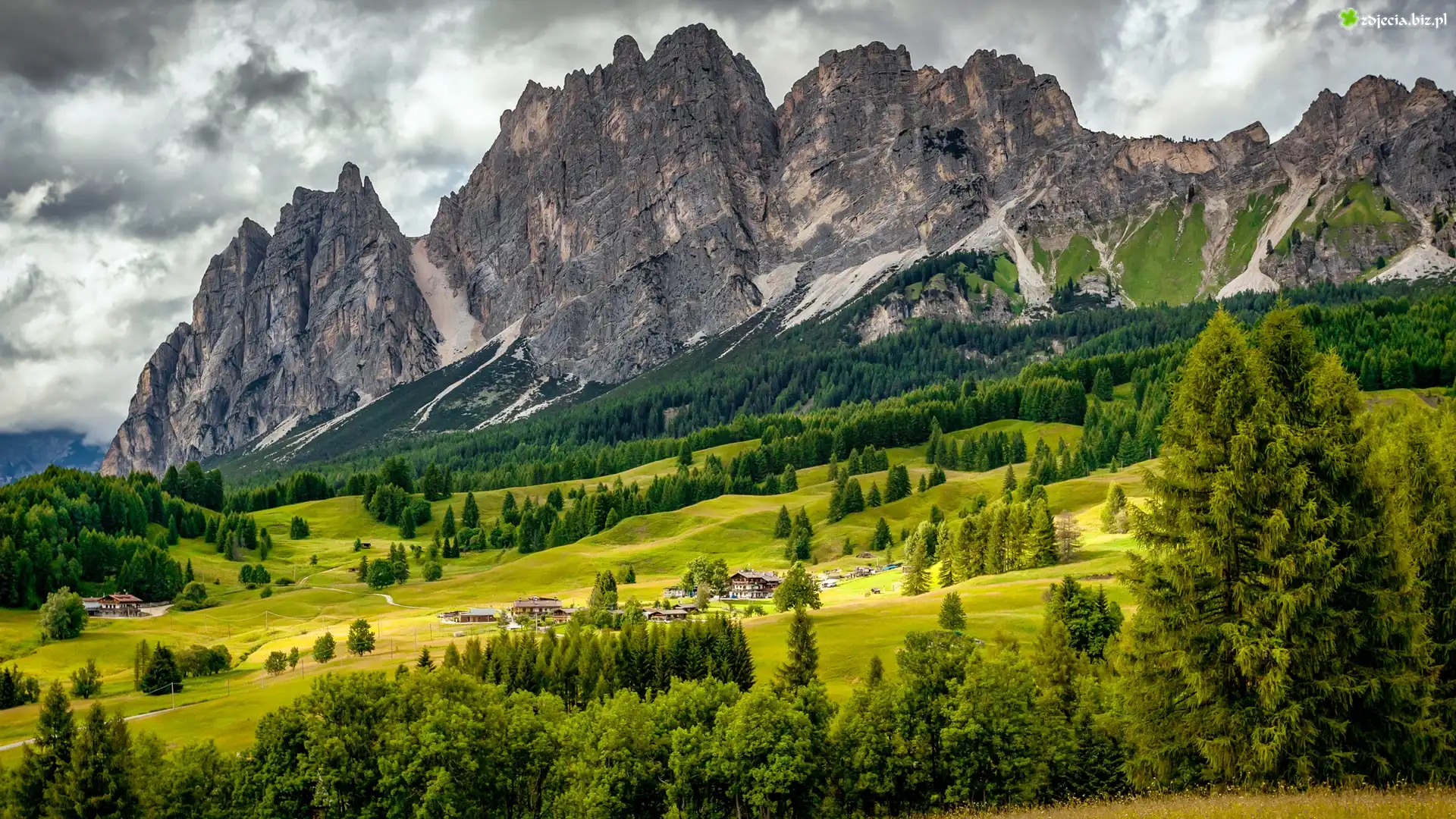 Zdjęcie, Góry, Dolomity, Las, Drzewa, Domy, Chmury, Włochy