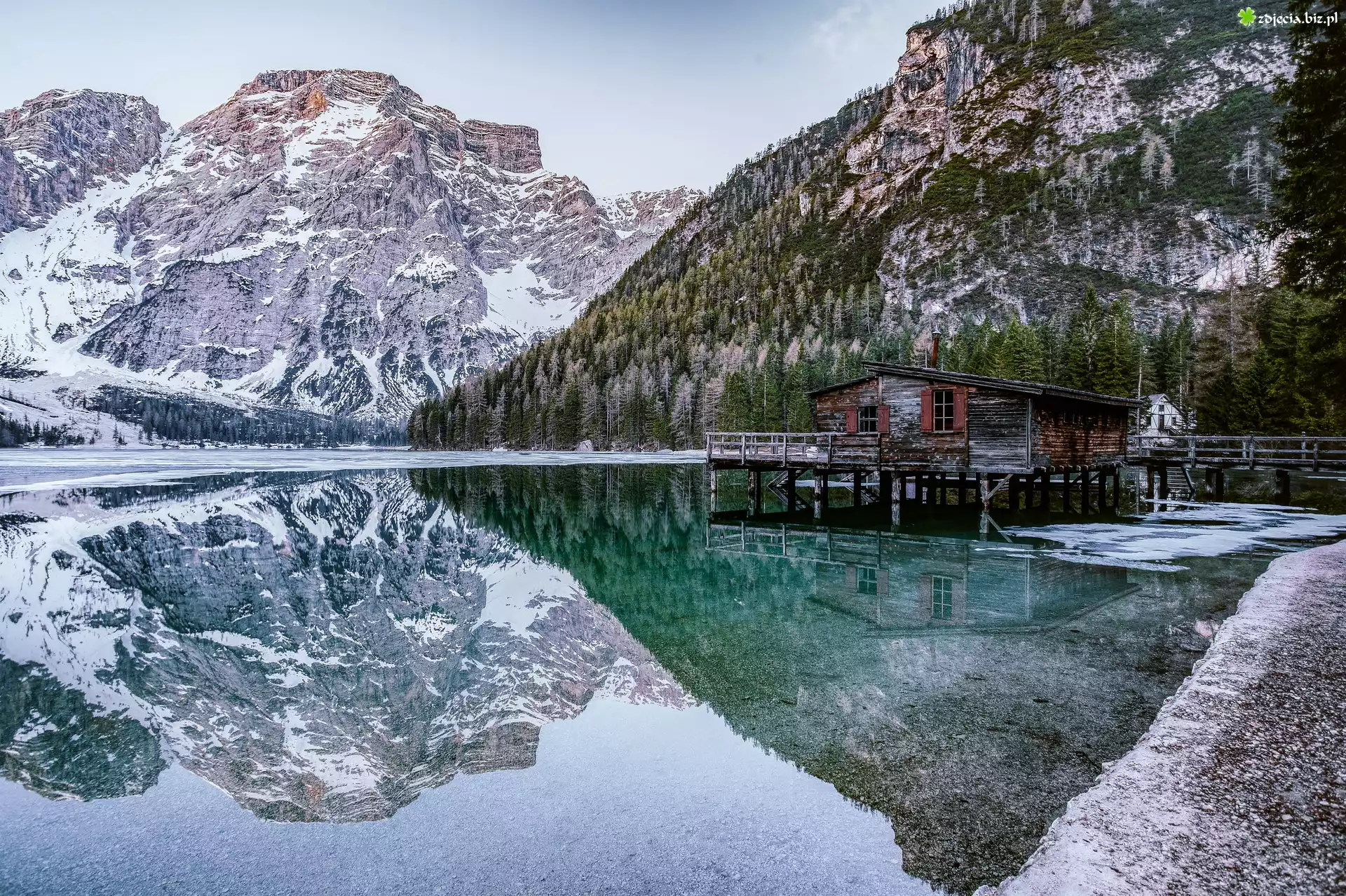 Zdjęcie, Domek, Góry Dolomity, Jezioro, Pragser Wildsee, Drzewa, Zima, Południowy Tyrol, Włochy