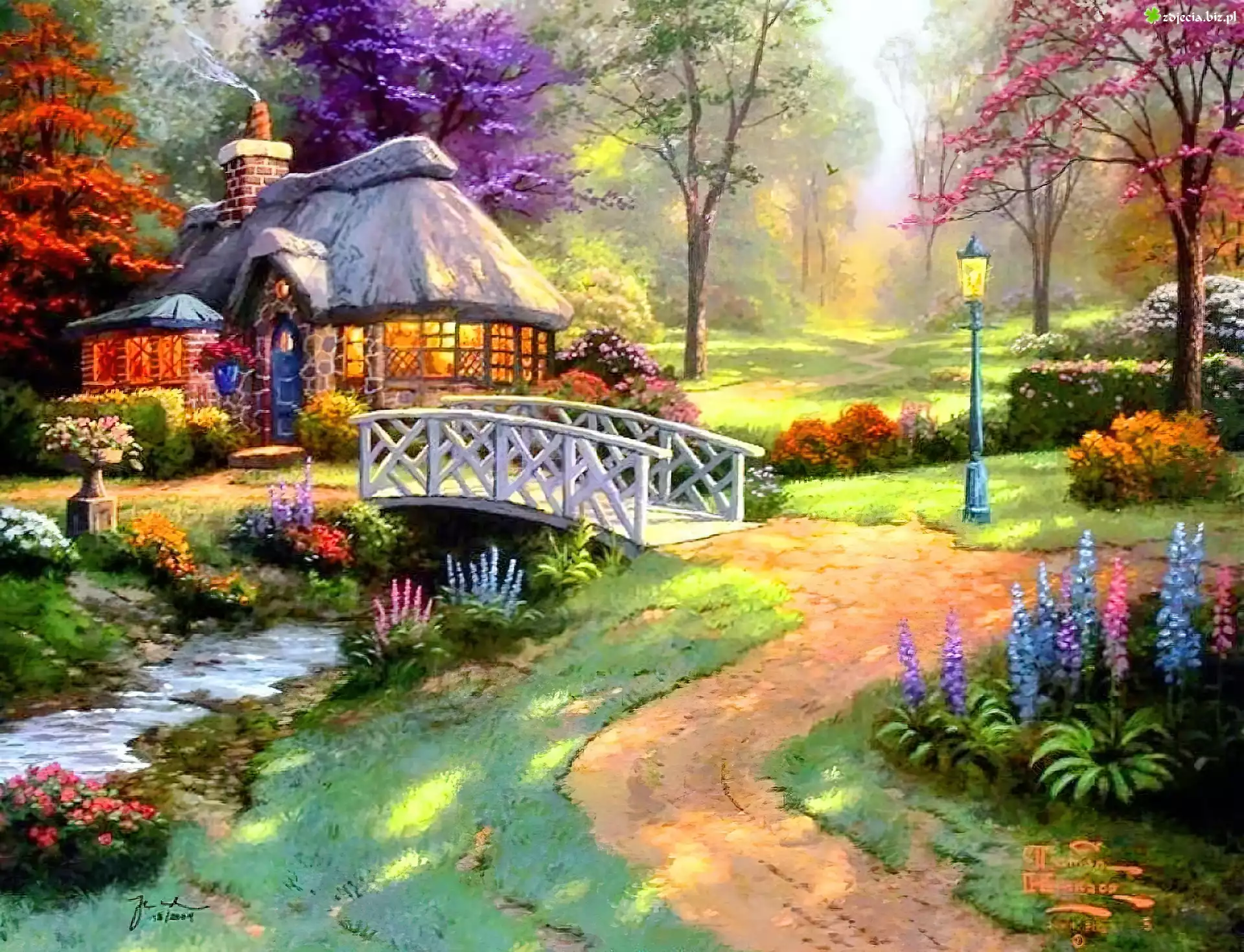 Zdjęcie Dom, Most, Rzeka, Droga, Kwiaty