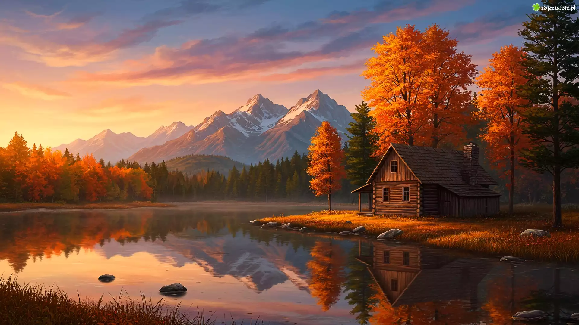 Zdjęcie Jesień, Dom, Drzewa, Rzeka, Góry