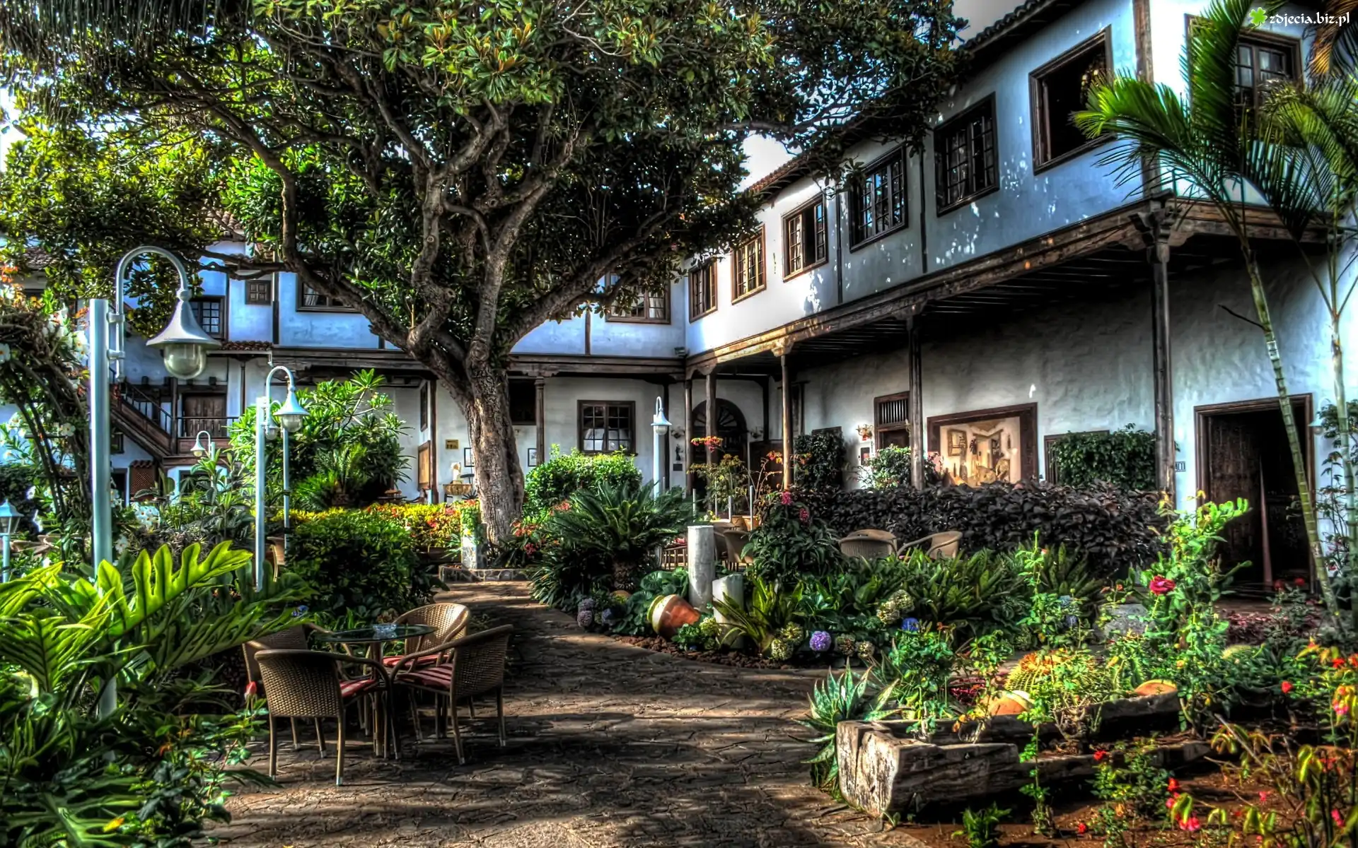 Zdjęcie Dom, Ogród, Kwiaty, Drzewa, HDR