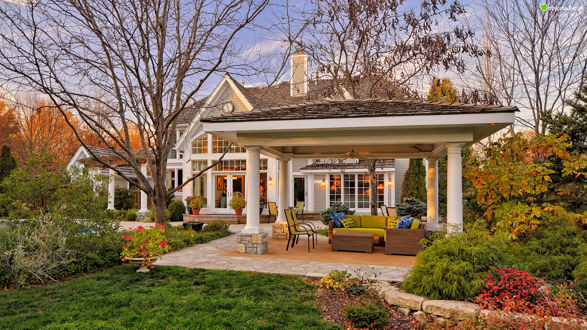Zdjęcie, Dom, Taras, Meble, Ogród, Drzewa, Jesień