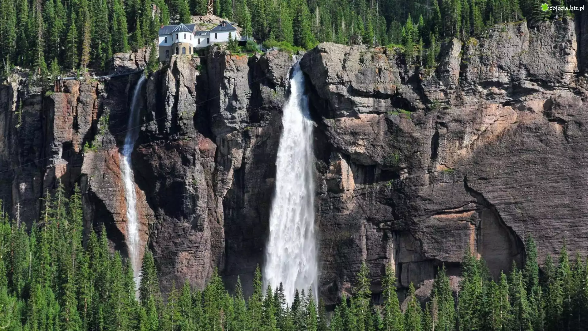 Zdjęcie Dom, Skały, Drzewa, Wodospad