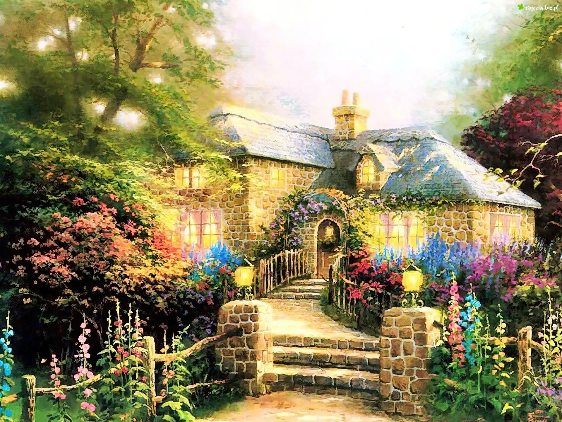 Zdjęcie, Dom, Ogród, Kwiaty, Płotek