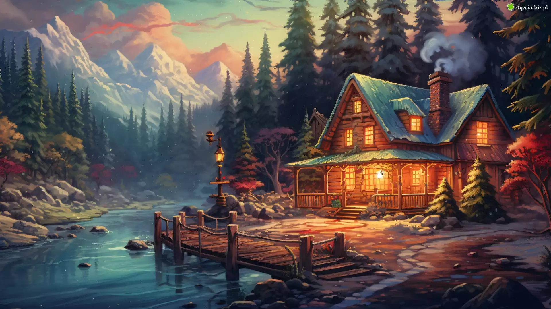 Zdjęcie Zima, Góry, Las, Drzewa, Udekorowany, Oświetlony, Dom, Latarnia, Rzeka, Pomost, Grafika
