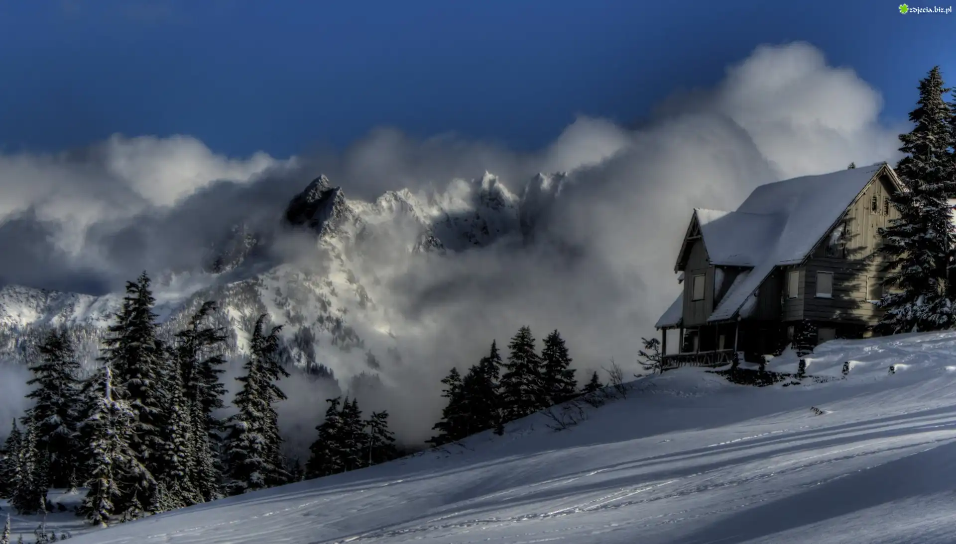 Zdjęcie Dom, Góry, Lasy, Mgła, Zima