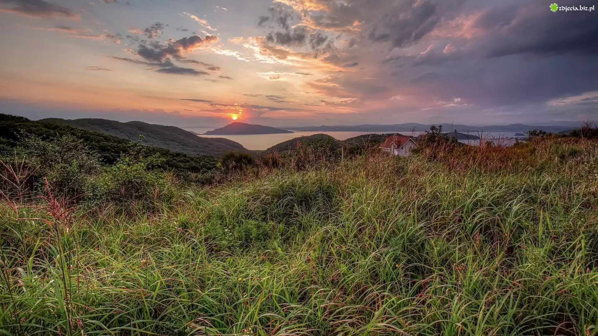 Zdjęcie Rosja, Kraj Nadmorski, Zachód słońca, Jezioro, Góry, Roślinność, Dom