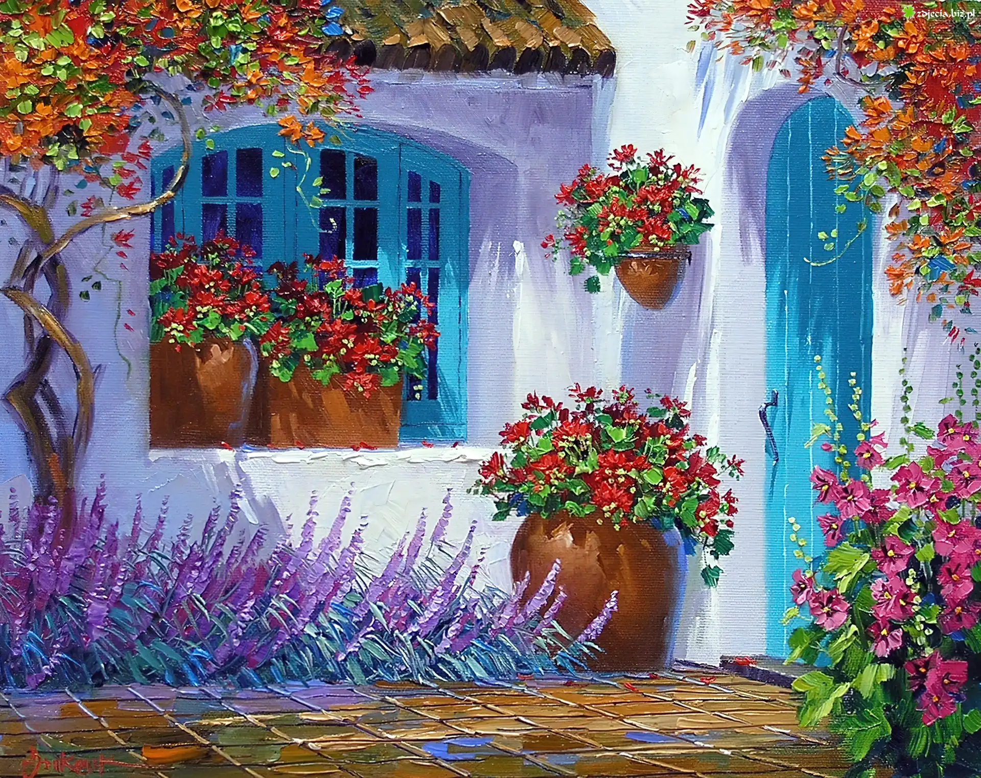 Zdjęcie Dom, Niebieskie, Drzwi, Okno, Kwiaty