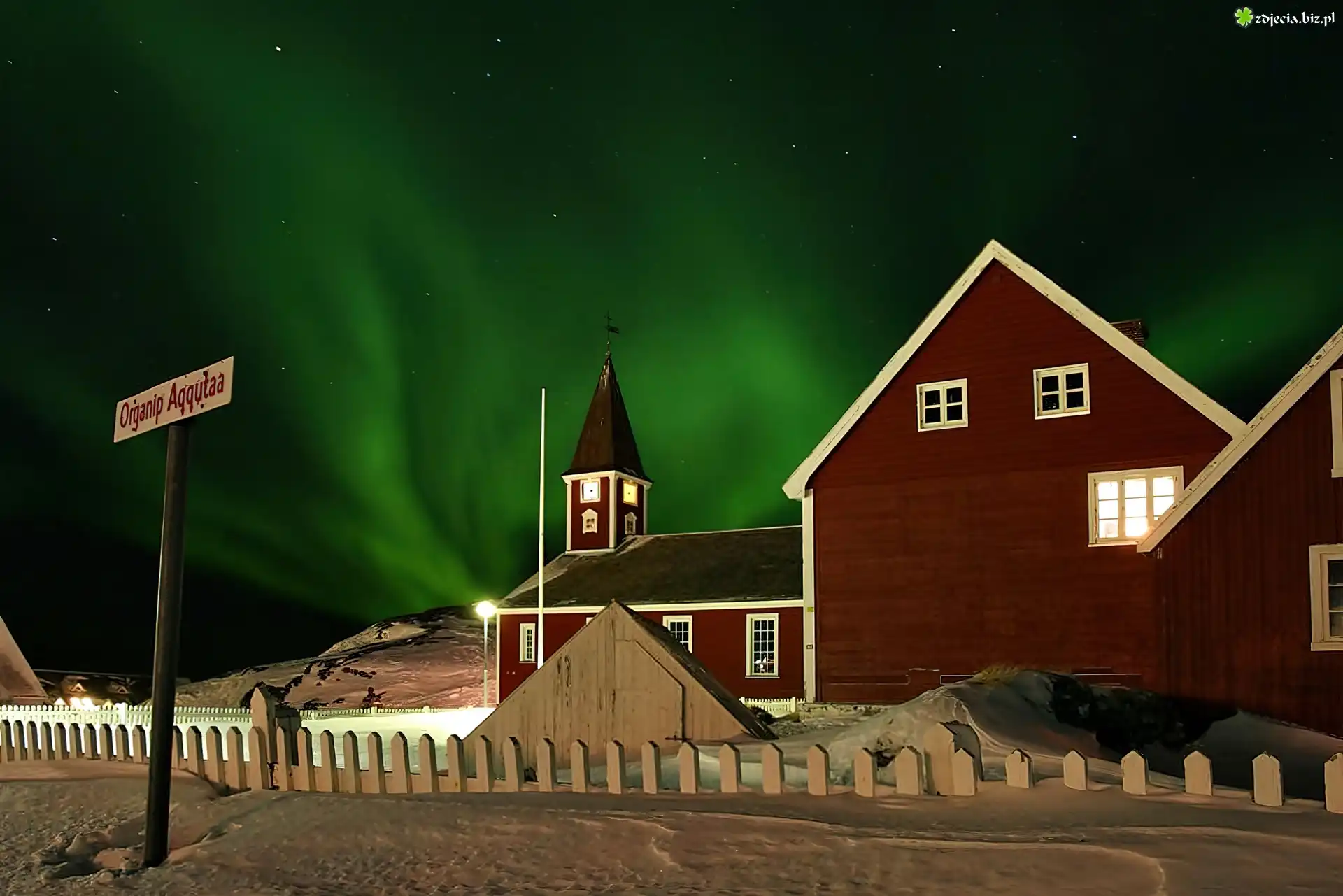 Zdjęcie Dom, Kościół, Zorza, Polarna, Gwiazdy