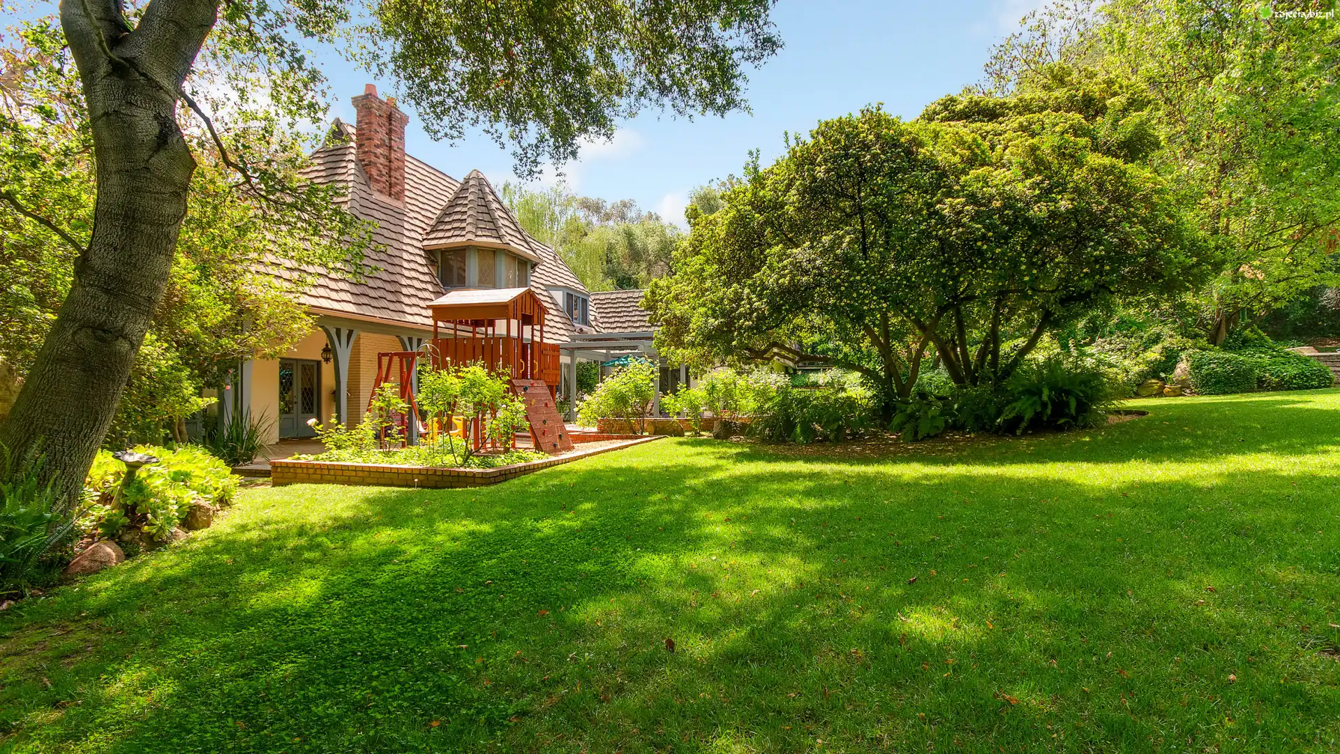 Zdjęcie Dom, Ogród, Trawnik, Przebijające, Światło