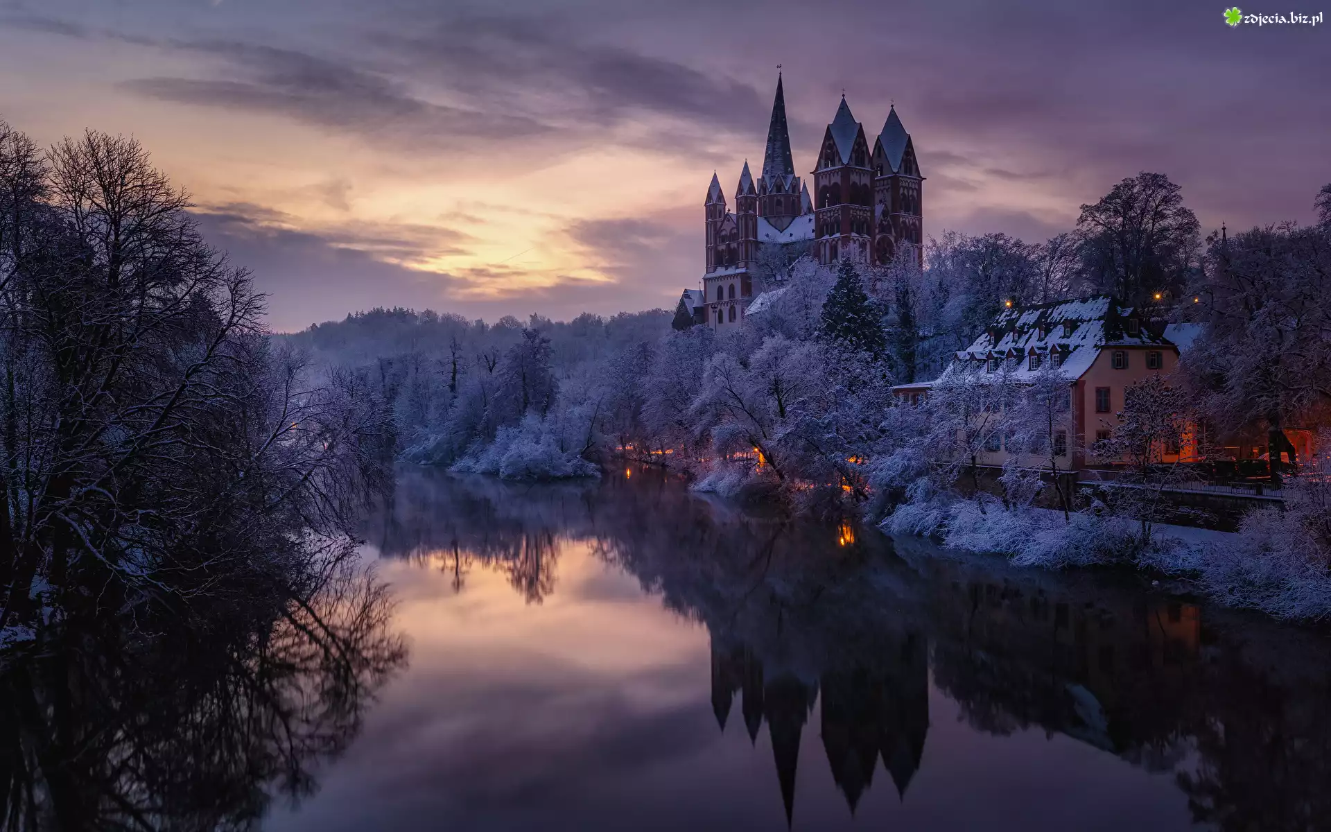 Zdjęcie Niemcy, Limburg, Rzeka Lahn, Katedra Świętych Jerzego i Mikołaja, Dom, Oszronione, Drzewa, Kościół |