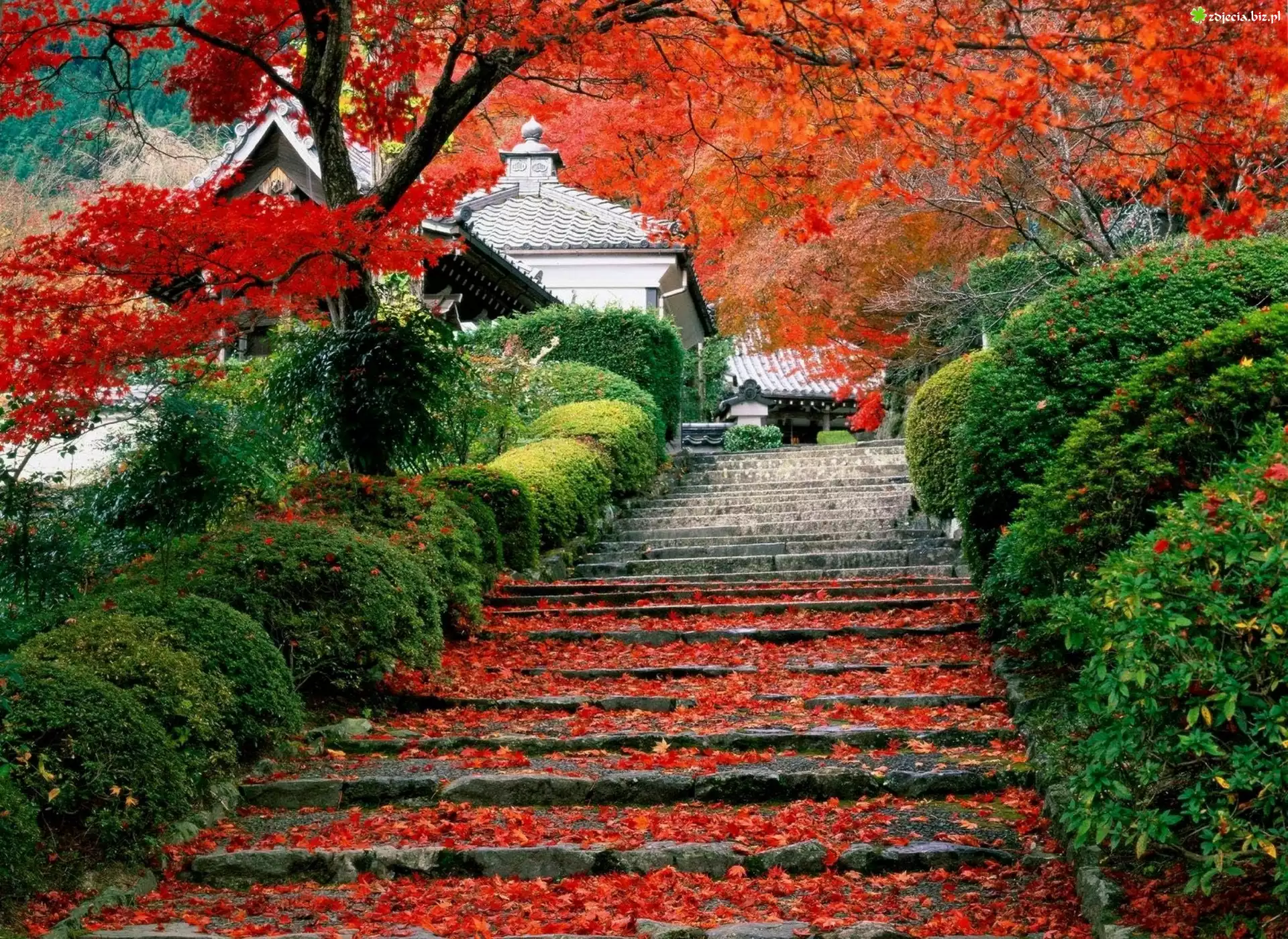 Zdjęcie, Dom, Japonia, Drzewo, Schody, Liście