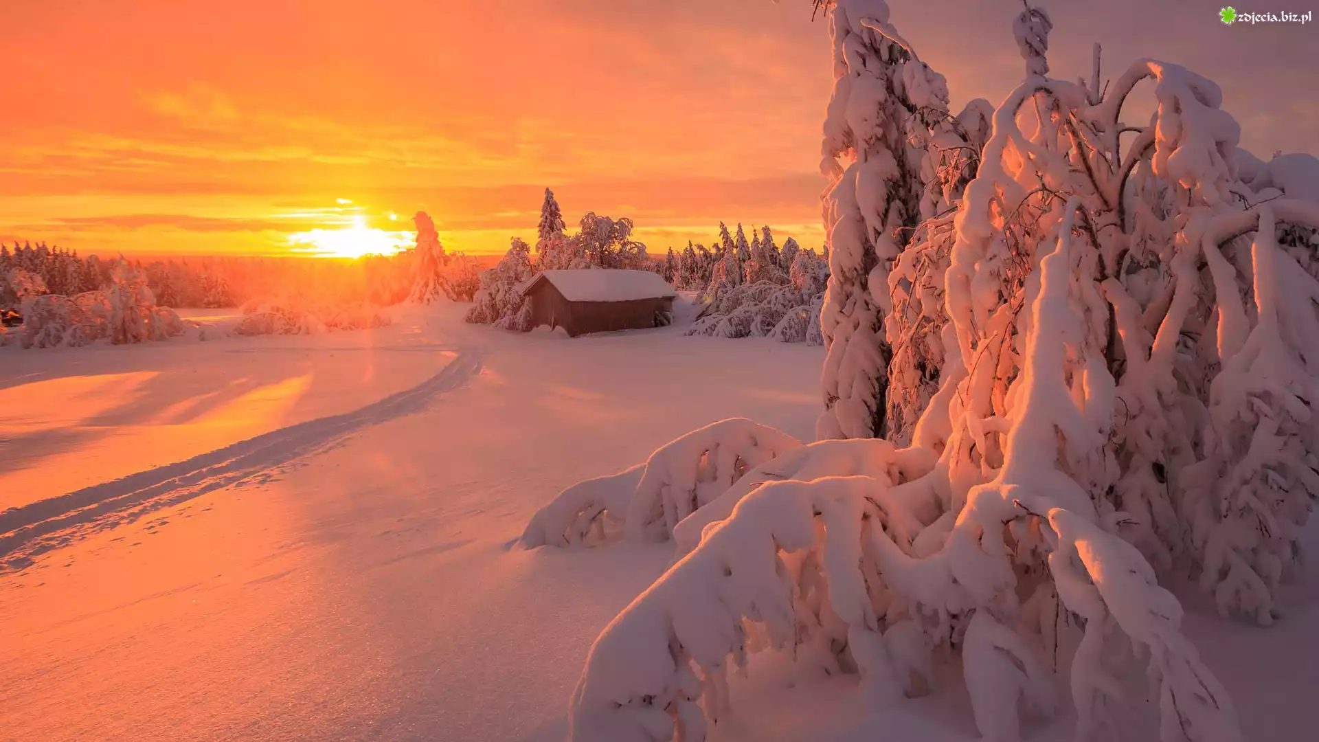 Zdjęcie Zima, Promienie słońca, Dom, Drzewa, Ośnieżone, Gałęzie