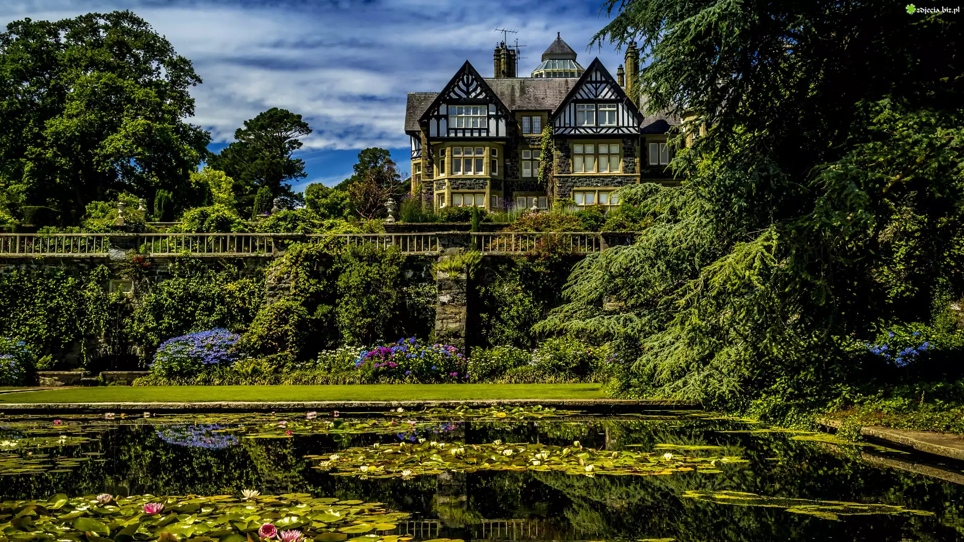 Zdjęcie Walia, Ogród Botaniczny Bodnant Garden, Dom, Bodnant House, Staw, Roślinność, Lilie wodne