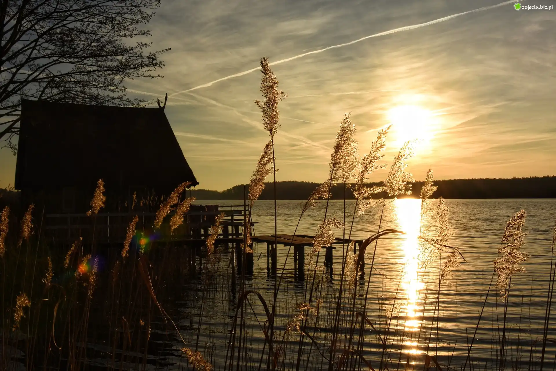 Zdjęcie Dom, Pomost, Jezioro, Trawy, Zachód słońca